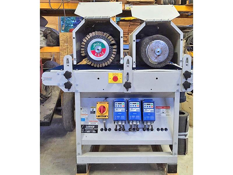 LARICK - 2-Head Brush Sander (2017)Machine features: (2) 15" Counterrotating & rotation reversible heads; enclosed in a Dust Collection Shroud. -- Feed belt & sanding head speeds: Variable by means of VFD. -- Machine currently setup with a steel brush & brass insert head. -- Can be used for minor destressing (bring out the natural grain) or denibbing (with nylon type brushes: not included). -- Head driven by: (2) 2 HP Direct drive motors. -- Current heads: Wire brush on the 1st head & brass inserts on the 2nd head.