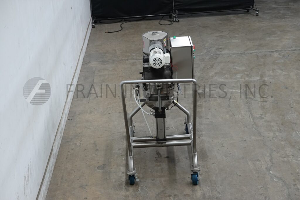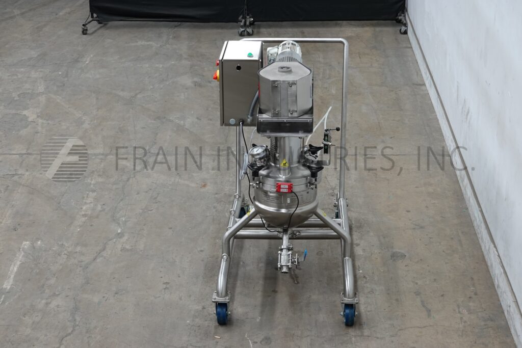 Lee Model 15LD9MT, 5 gallon, 316 stainless steel, double motion 1/2 jacketed kettle with amount of product per hour – depending on materials and application. Vessel dimensions: 14" diameter x 12" Deep with a 6" straight wall. Equipped with tilt out double motion, counter rotating scrape surface agitation, with bolt down cover and (2) 2-1/2" OD and (1) 2" OD sanitary top ports, Full jacket rated at: MAWP of 60 psi @ 308°F and MDMT of -20°F @ 60 psi with (1) 1-1/2" OD threaded side bottom jacket port. Dish bottom with 3" OD center bottom sanitary discharge with 16" floor clearance and secondary butterfly valvewith temperature senser. Control panel has reset, e-stop buttons with vari speed controller. Mounted on stainless steel frame with push handle and locking casters.