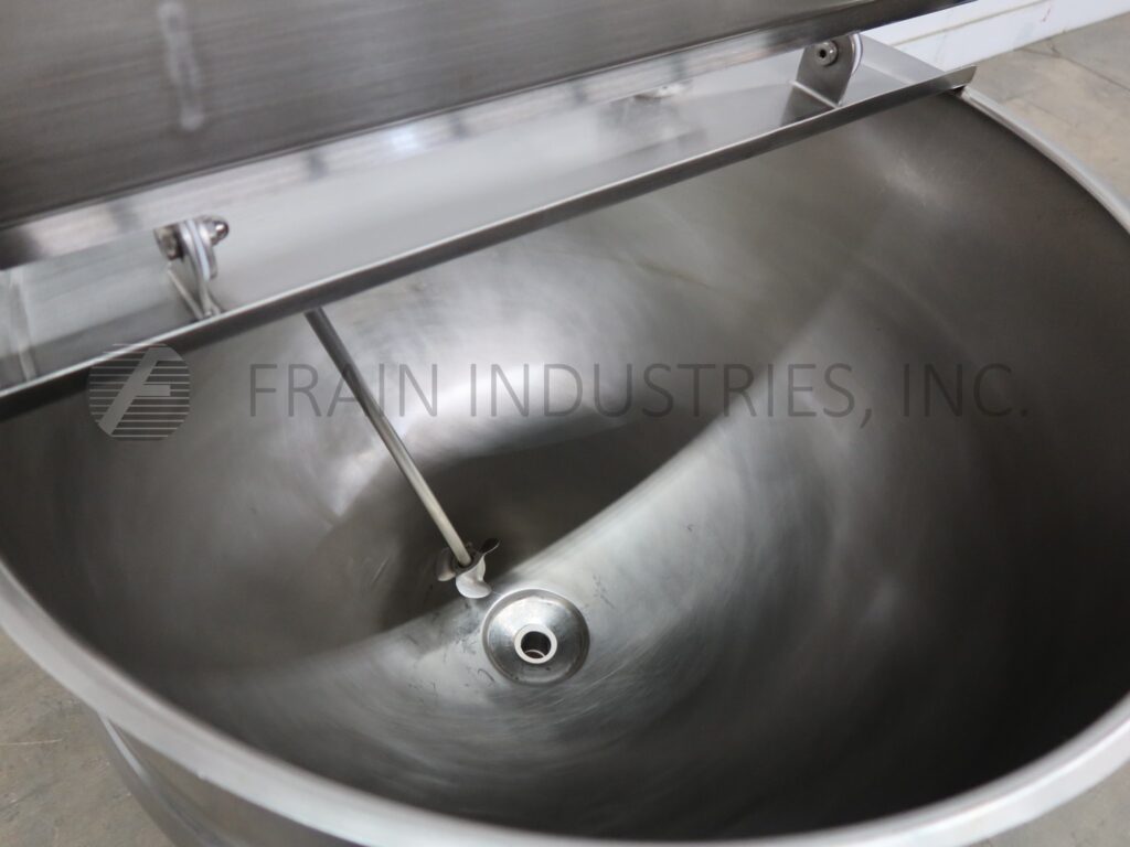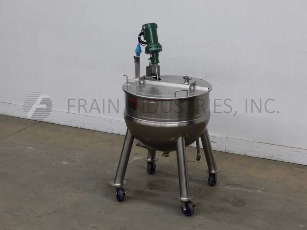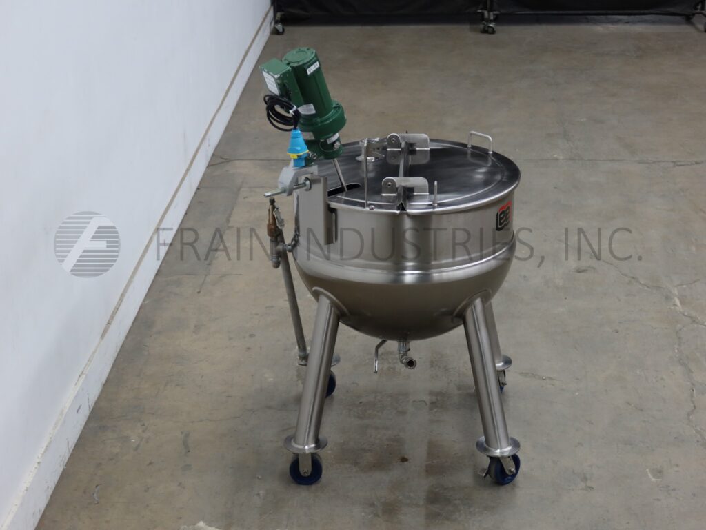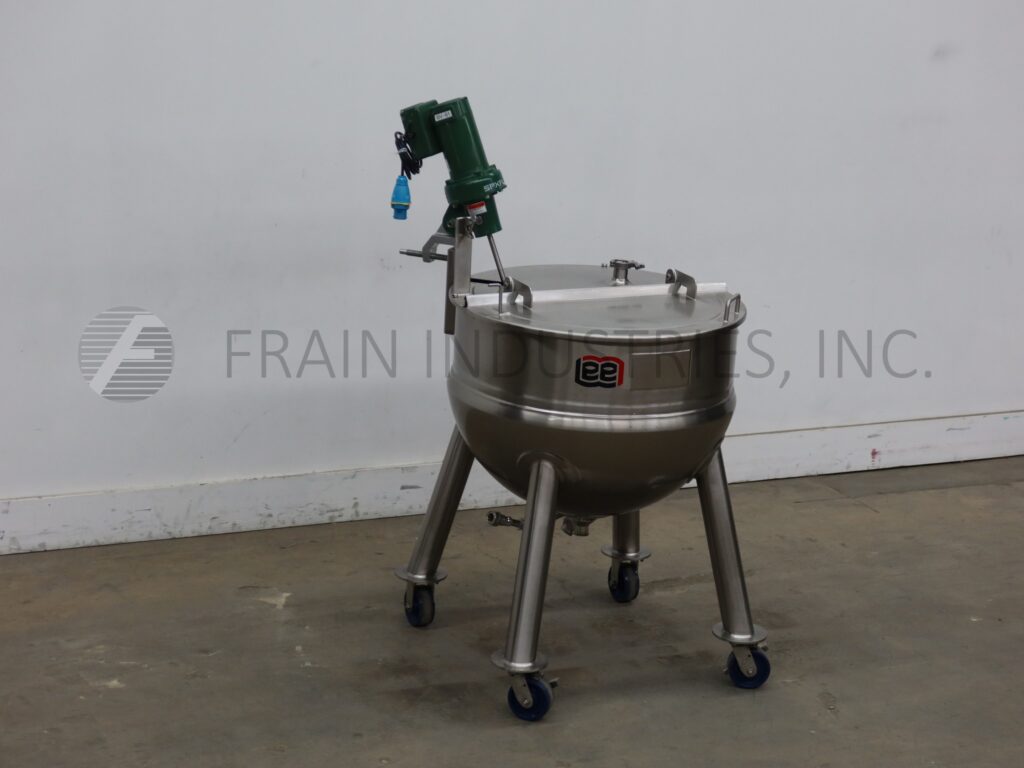 Lee, Model 225LD, 225 liter 316 stainless steel jacketed kettle. Vessel Dimensions: 32" diameter x 24" deep with a 10" straight wall. Equipped with prop agitation powered by a ¼ hp drive, flip up cover and 1½" tri-clamp center bottom discharge with ball valve and 15" ground clearance. Mounted on (4) tubular leg frame with locking casters.