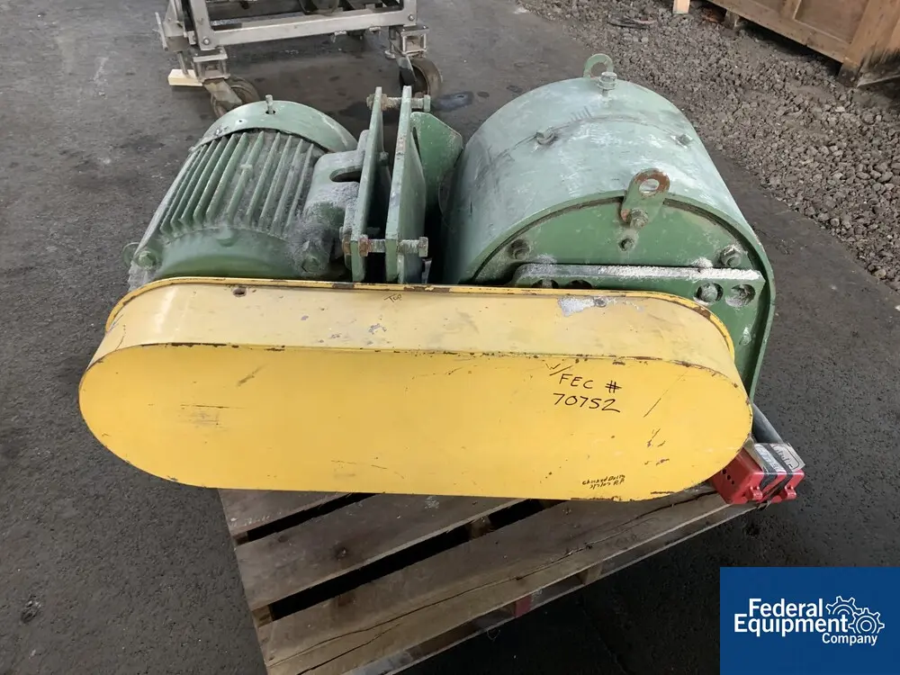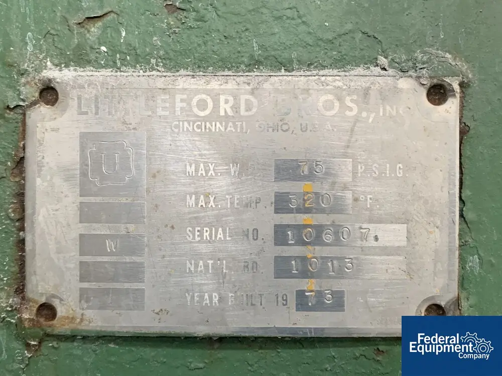 Used FKM2000E Littleford mixer, stainless steel construction, 73 cu ft total capacity, 42 cu ft working capacity, provision for (3) high speed choppers(less chopper motors), jacketed for 75 psi at 320°F, standard access doors, 10", 18" x 30" top ports, center bottom discharge with pneumatically operated flush valve, air purge seals, 60 hp, 230/460 volt main drive thru Falk gearbox, machine serial# 10607, national board# 1013, built 1973.