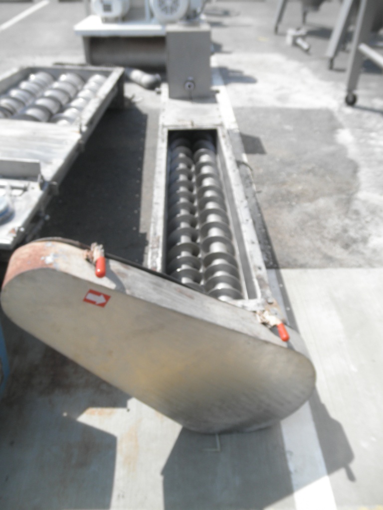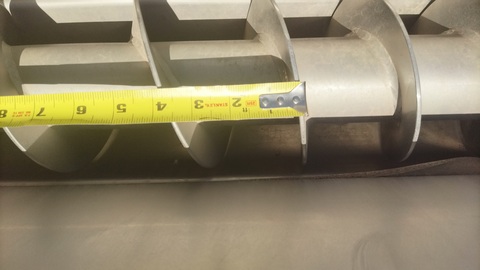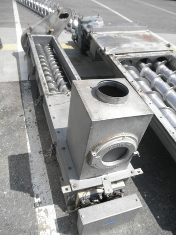 Live bin bottom with (2) screws, measuring 5" diameter X 8' long, stainless steel construction. Offered less motor. Previously used at food processing facility and in good condition. Screws are densifying screws where the spacing between flights lessens as the auger discharges. Spacing is approximately 6" between flights at feed and 3" between flights at discharge.