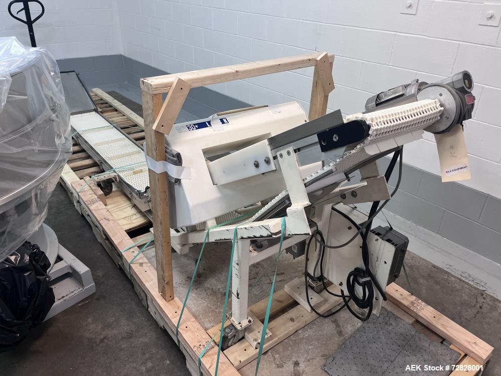 Lock Metal Check 9 Metal Detector. Model: HDS. S/N: 20264. Height at conveyor infeed: 46 in. Height at conveyor exit: 47 in. Maximum aperture/clearance above belt: 30 in. W x 2 in. H. 16 in. L x 28 in. W. Sensitivity tested with test strips as 2.5 mm ferrous metals, 2.5 non-ferrous metals, and 3.5 mm non-magnetic ...more