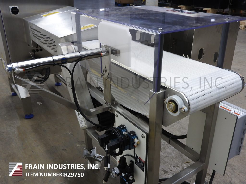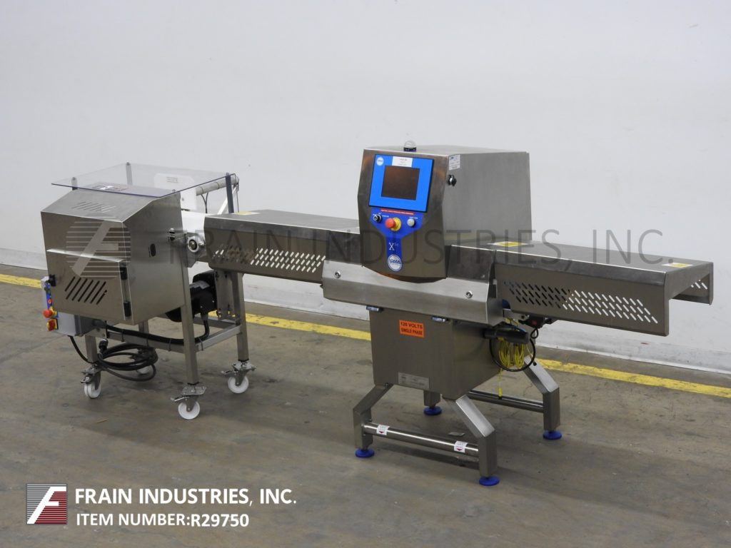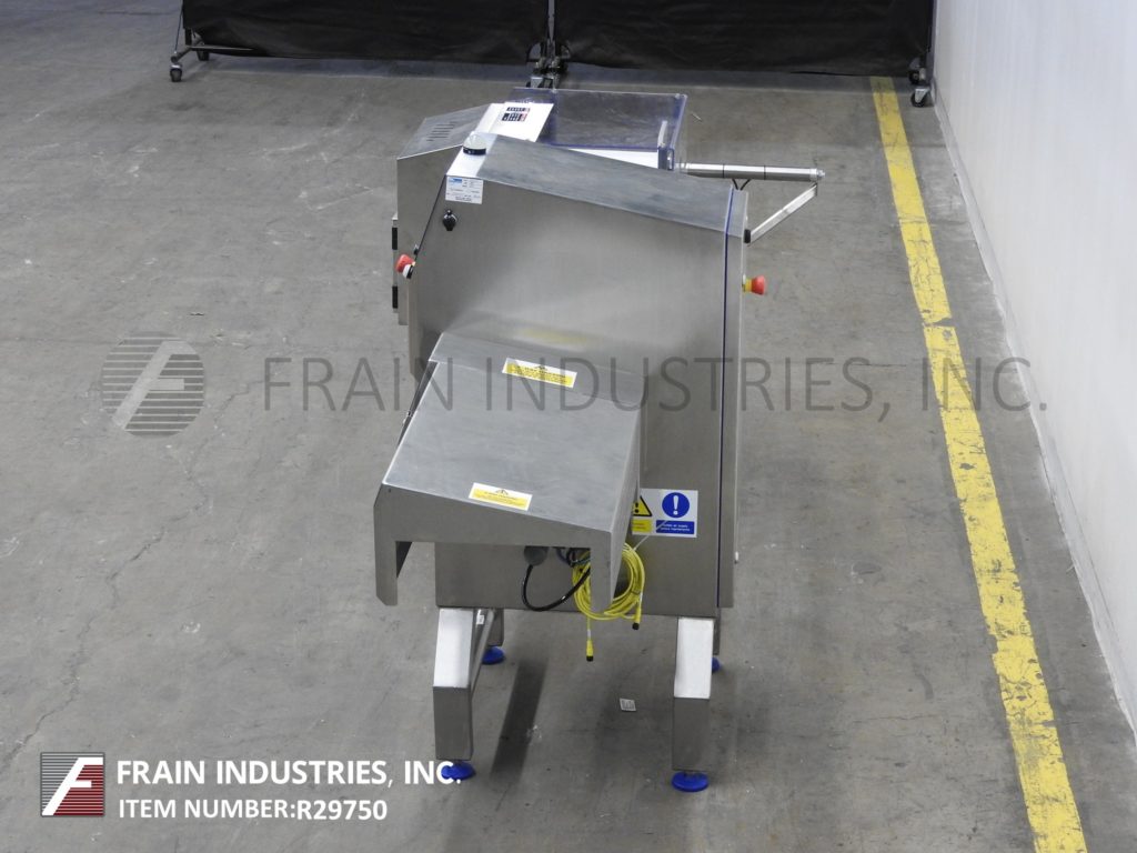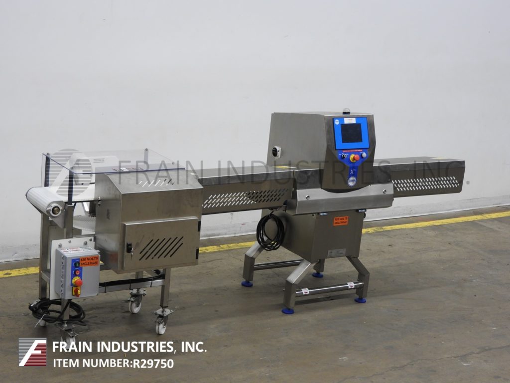 Loma Model X5C, stainless steel, X-Ray inspection system. Rated Conveyor speed; 33 to 164 feet per minute with number of product – depending on materials and application. 304 Stainless steel dry wipe down construction. Equipped with food grade anti static conveyor and Intralox style discharge conveyor with mechanical reject and collection bin. Total aperture: 13¾" in Width; 5" in Height. Inspection Window: 100mm in Height; 300mm in Width. Features touch screen interface (data log capable via USB). Operating environment: 50°F to 95°F. Performance dependant on materials, application, machine configuration and environment. Mounted on height adjustable leveling pads.