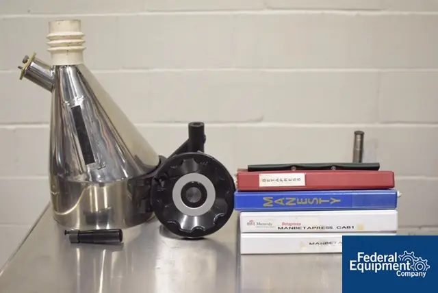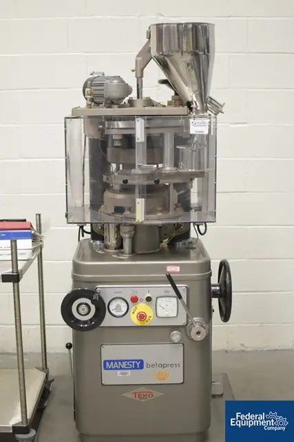 Manesty, Model Beta Press, 16 station rotary tablet press with "B" tooling rated from 50 to 650 tablets per minute – depending on materials, application, machine configuration and environment being run in. Maximum operating pressure of 4 tons. 10" diameter x 14" long stainless steel product ...more
