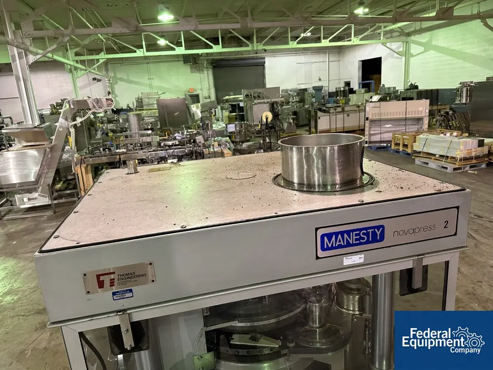 Used Manesty rotary tablet press, model Novapress, 45 station, B tooled, 15/8" max tablet diameter, 11/16" max depth of fill, 6.5 ton compression pressure, with 1 ton pre compression, single sided with force feeder and feed hopper, rated up to 270,000 tablets/hour, serial# 16071NA.
