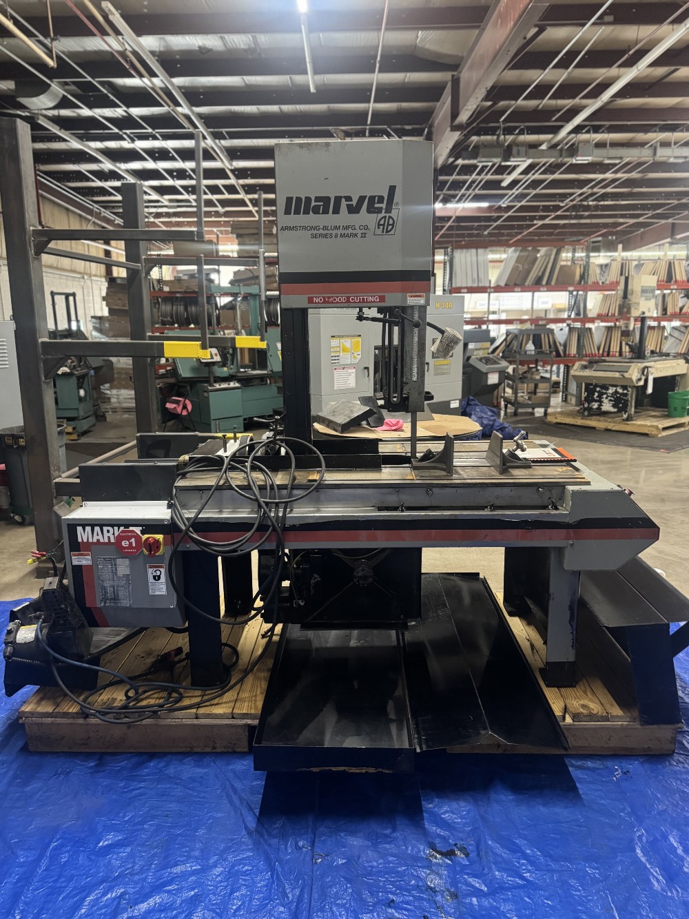 18" x 22" Marvel #8-Mark-II, vertical semi-auto band saw, 14' 6" x 1" blade, 50-450 FPM Manufacturer: Marvel Model: 8-MARK-II Max Throat or Width: 18.00 Max Height / Under Guide: 22.00 Stock # 108 Request a Quote For Sale by Detroit Bandsaw Surplus Record Dealer Since 2024 Contact Seller Southfield, MI Joe Goudeseune 248-93...> Show Seller's Phone Number 248-939-0120 Let the seller know you found their listing on Surplus Record! View More Detroit Bandsaw 's ListingsDescription Cutting Capacity: 90 degrees: 18" horizontal, 22" vertical. 45 degrees: 18" horizontal, 12.75" vertical. Round: 18" diameter. Blade: Length: 14'6". Width: 1". Thickness: 0.035". Speed: Range: 50-450 FPM (feet per minute). Feed Force: Range: 0-140 lbs (adjustable). Work Table: Size: 24.25" x 33". Height: 34.5". Tilting Head: Tilt: 45 degrees left and right. Other Features: Motor: 5 HP. Coolant System: Built-in wet coolant system. Table: T-slotted work table. Automatic Blade Tensioning: Included. Blade Break/Stall Detection: Standard equipment. Request More Information from SellerGet Your Price from Detroit Bandsaw! "*" indicates required fieldsName*Company*Email* PhoneZip / Postal Code*QuestionMake an OfferRequests Send me a shipping quote I am interested in financingSend Copy Email me a confirmation of this inquiryBuyer Protection Use our partner Escrow.com to buy or sell equipment safelyBuyer Protection Send me info about buyer protectionThis field is hidden when viewing the formDealer Email Buyers Who Viewed This Listing Also Viewed … 18" x 22" Marvel #8-Mark-II, vertical tilt frame saw, 14' 6" x 1" x .35"blade, 2 HP, newCategory: Vertical Band SawsSeller: Vander Ziel Machinery SalesLocation: Alto, MI Mfr: MarvelModel: 8-MARK-II Marvel #8-MARK-II, vertical bandsaw,Category: Vertical Band SawsSeller: SOMINN Machinery SalesLocation: Dodge Center, MN Mfr: MarvelModel: 8-MARK-II 18" x 22" Marvel #8-Mark-II, vertical bandsaw, rebuilt (2 available)Category: Vertical Band SawsSeller: Montgomery Peterson IncLocation: WINDSOR LOCKS, CT Mfr: MarvelModel: 8-MARK-IIThis machine has been stripped of all sheet metal panels and dipped to strip all dirt and paint. The machine was pressure washed to remove all residual dirt and grease. We removed the column and the carriage to allow replacement of all carriage bearings, guides & pressure blocks. We have checked both band wheels ...more Marvel #8-Mark-II, sawCategory: Vertical Band SawsSeller: Mid Atlantic MachineryLocation: Harrisburg, PA Mfr: MarvelModel: 8-MARK-II 18" x 22" Marvel #Series-8-Mark-II, vertical tilt frame band saw, 184" x 1.25" blade, 5 HP, newCategory: Vertical Band SawsSeller: Kevins Equipment Co. KECLocation: Houston, TX Mfr: MarvelModel: 8-MARK-IIShare × "*" indicates required fieldsYour Name*Your Email* Recipient's Email* Note to Recipient
