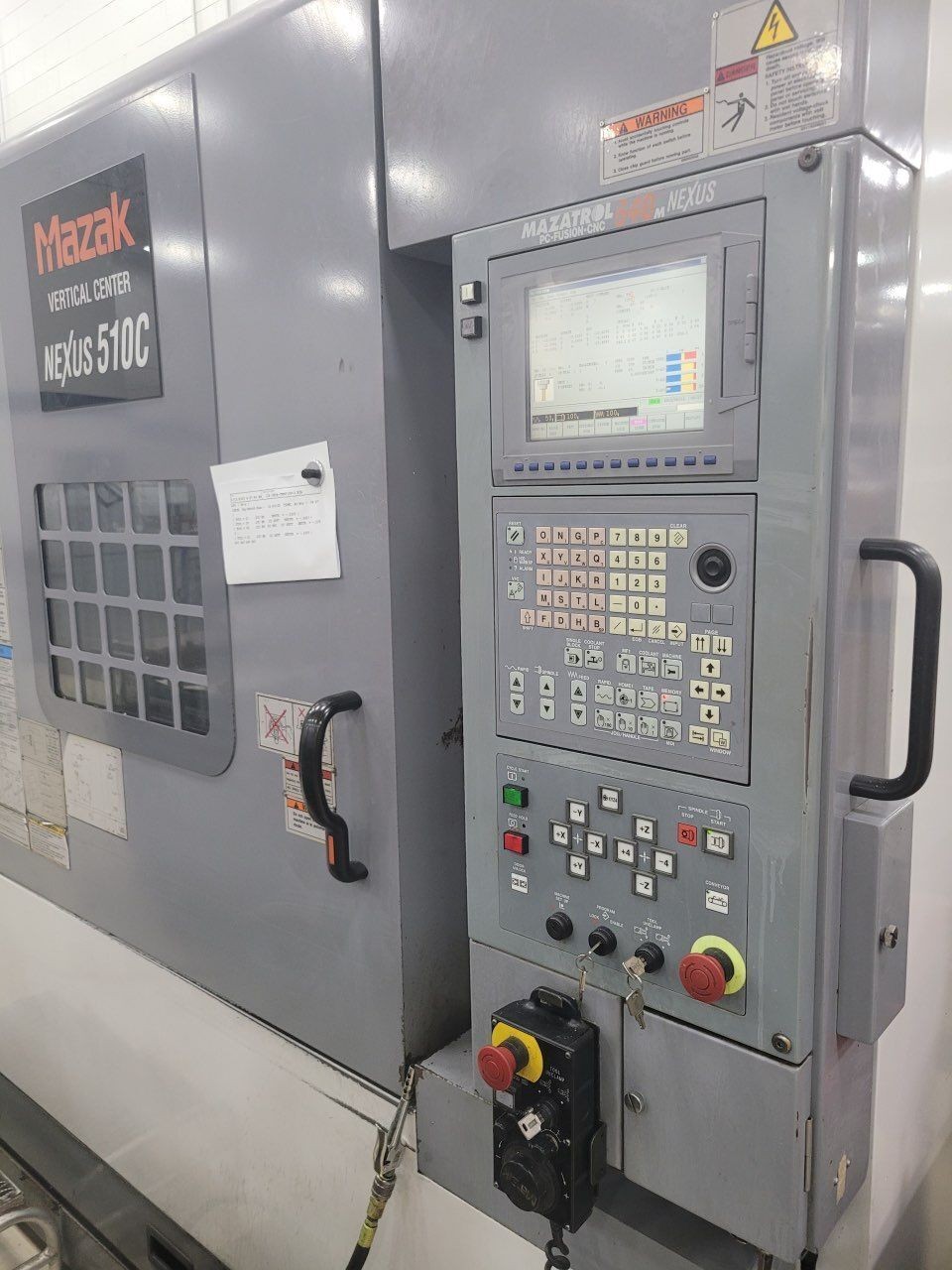 Mazak #Nexus-VCN-510C, 30 side mount tool changer, 41" X, 20" Y, 20" Z, 12000 RPM, #40, 25 HP, Mazatrol Fusion 640M, 51.18" x 21.65"tbl., Renishaw probe, 213 psi thru spindle coolant, 2003