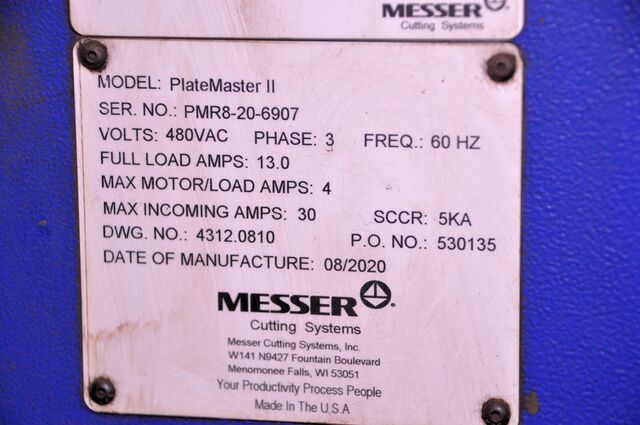 Year 2020, Maker: Messer Cutting Systems, Model: Plate Master II, S/N: PMR8-20-6907, Single Head CNC Plasma Cutter, Hypertherm Hyperformance Plasma HPR400XD Power Supply with Cooling System, 8' x 30' Water Table, 11.5' x 38' Rail to Rail.