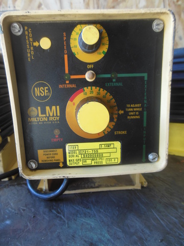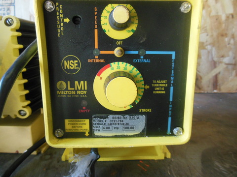 LMI Pumps C721-75S Series C Chemical Metering Pump, 4 GPH (96 gpd) at 100 PSI (6.9 Bar), 120V AC, Fast Prime, Pulse Input with Dual Manual Control, Polypropylene Head/Fittings, PTFE O-Ring, PE 0.5" OD Vinyl, 0.938" OD Connection. Serial number 950108639.
