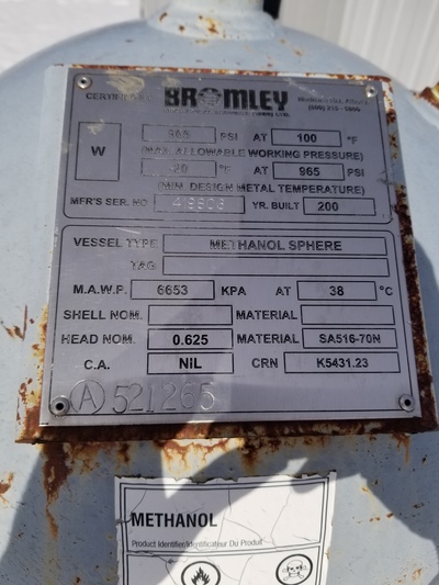 For sale: A 36-inch Methanol Sphere manufactured by Bromley in the year 2004. This vessel operates at a pressure of 965 psi and is suitable for sweet service type. The current condition is classified as 'C' (usable but not in operational status) and it is disconnected from service. Located in Drayton Valley, AB, Canada. Please note that size confirmation is required.