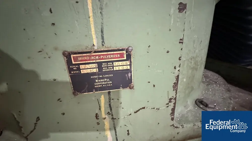 Used MikroPul ACM air classifying mill pulverizer, model 60ACM, carbon steel construction, 3000 rpm max main shaft, with 75 hp, 230/460 volt motor,1800 rpm motor, separator classifier shaft, with 7.5 hp, 230/460 volt motor, on base, serial# 87C5036.