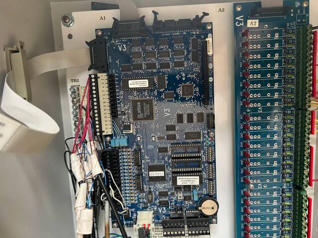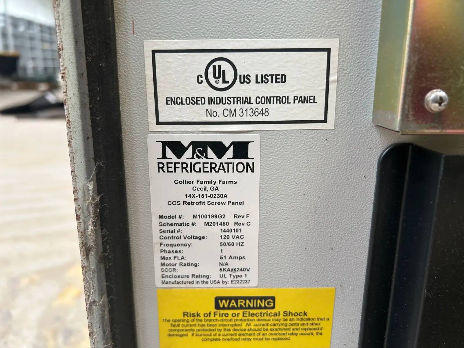 M&M CCS Retrofit Screw Micro Control Panel. Model: M100199G2. Serial No: 1440101. Control Voltage: 120 VAC. Frequency: 50/60 Hz. Ph: 1. Max FLA: 51 Amps.
