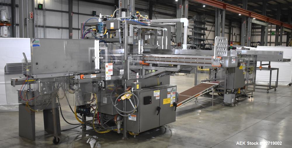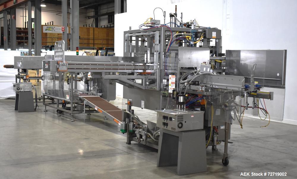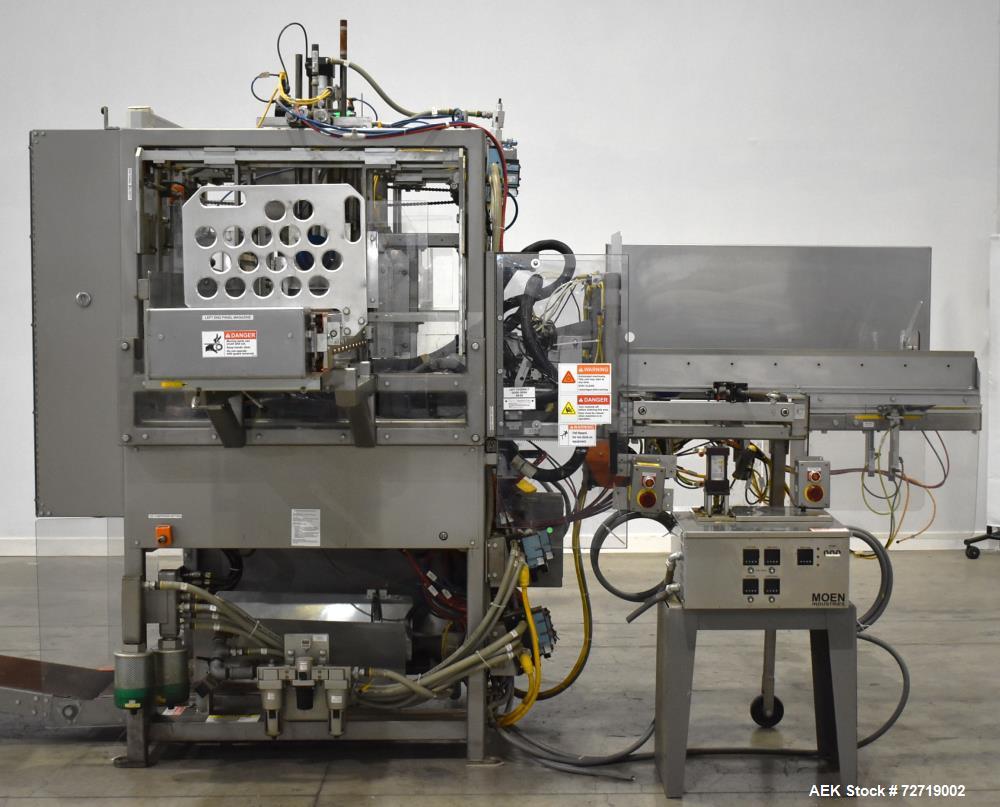 used- moen model pf106-bifqv bliss box former/bliss erector with moen model ss-231 continuous motion case sealer. erector capable of speeds up to 30 cases per minute. forms a 3 piece bliss box out of end panels, internal flanges and body wrap. case size range: 8" - 24" (length) x 8" - 24" (width) x 4" - 12" (height). flat die cut blank range: body wrap length: 16" - 56", body wrap width: 12" - 29", end panel width: 8" - 28", end panel height: 4" - 17". has a proface hmi and allen bradley compactlogix plc control. 3/60/460v. moen case sealer capable of speeds up to 35cpm. case / box size range 7" to 18" long x 8" to 20" wide x 4" to 14" depth. moen glue system. last running pet food.