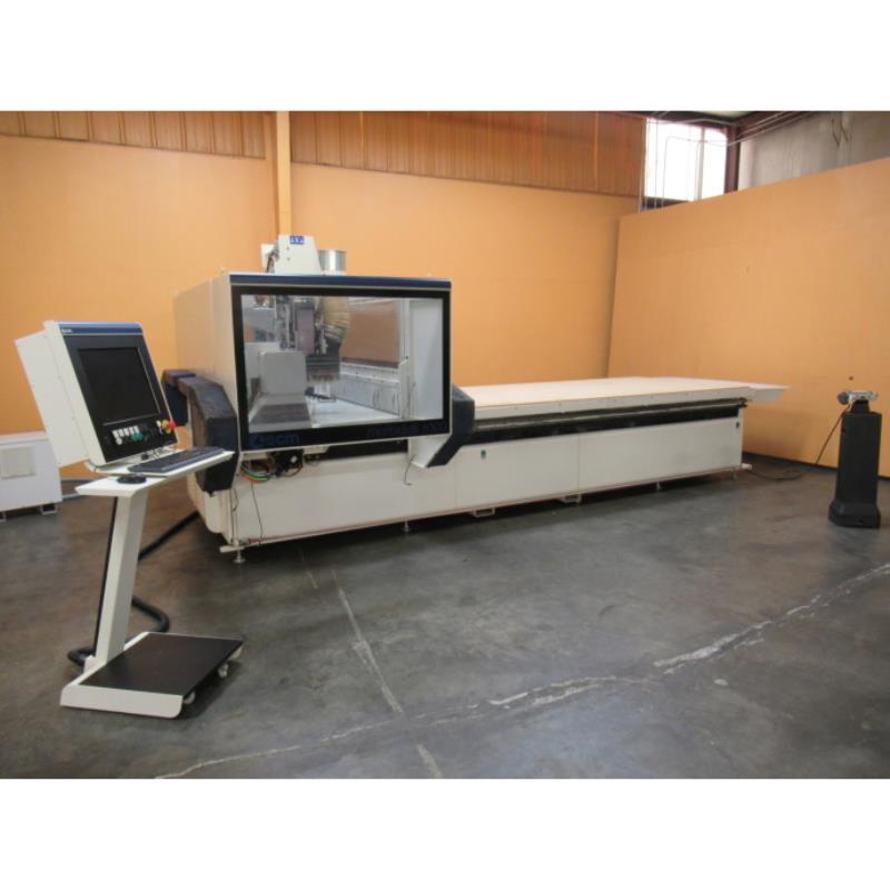 MORBIDELLI - N 100 15: Flat Table Machine with ATC, Boring, Rake -- Specifications: 5' x 12' Worktable 13 HP (S6) air cooled electro spindle with HSK F 63 quick release tool holder 1,500 to 24,000 RPM inverter-controlled spindle speed Aluminum solid worktable that can nest full sheets or be used for routing smaller components 14-Position tool changer mounted to side of machine (12) Vertical drills: (7) in X axis and (5) in Y axis X/Y maximum positioning speeds is 35 meters/min (115 feet/min) Z axis stroke 250 mm (9.84") Maximum panel passage 150 mm (5.90") (2) 300 m/H vacuum pumps Mobile console with 17" LCD display with Windows 7 operating system XILOG PLUS Operator Interface and Xilog Maestro Cad Cam free form software with labeling. 7" color universal remote-control pendant allows for the effective management of all machine functions from movement of controlled axes in manual jog mode to loading and execution of a program. Fitted with a USB port which allows for a quick load and setup of new programs. Air-Conditioned electrical cabinet. Safety bumpers on both sides of the mobile unit allows for safe movement while saving space by eliminating caging around the machine. Electronic tool detecting length (touch probe) allows for detecting tool length without running a test program Dust Collection: (1) 200 mm (7.87") on router (1570 cfm) Operating air pressure with 3/4" ID hose 7 ATM (102 psi) Autotransformer allows choice of 208/230 or 460 volt 3 phase operation
