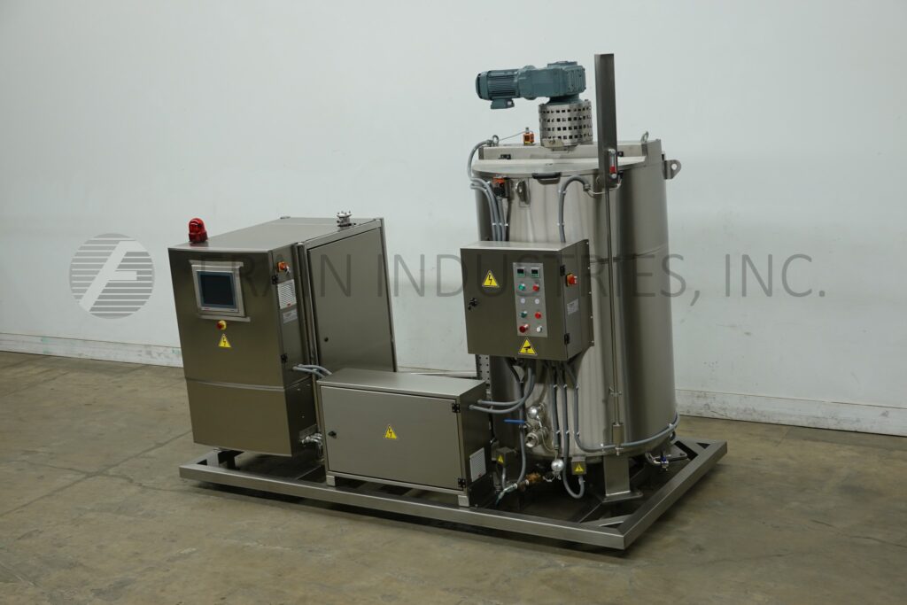 Morcos stainless steel skid mounted melt tank and tempering system with self contained heating system.