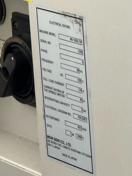 Mori Seiki MV65B/50 CNC Mill, (subject to buyer verification):, Table Size 76″x26″, X-Axis Travel 60″, Y-Axis Travel 25.6″, Z-Axis Travel 25.6″, Tool Positions 30, Spindle Speed 4000 RPM, Spindle Taper CAT 50, Spindle Motor 25 HP, Maximum Table Load 4400 lbs., Machine Weight 30,000 lbs. ...more
