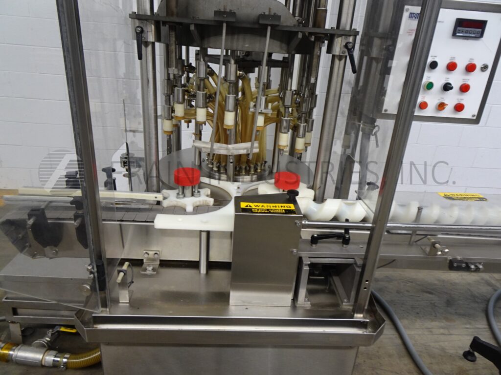 MRM Elgin Model R50GSF18, Automatic, 18 head, stainless steel rotary, fill to level pressure gravity filler rated from 24 to160 containers per minute – depending on materials, application and machine configuration. Capable of handling containers 1/2 once to 2-1/2 gallons (with proper change parts). Equipped with 168" long x 3-1/2" wide container conveyor has 30" long worm screw to star wheel infeed and discharge with top gear drive and (16) 1/2" OD stainless steel nozzles set on 5" centers, with bottom up fill and no container / no fill. Control panel has start, stop, reset and e-stop push button controls. Mounted on stainless steel frame with safety guarding.