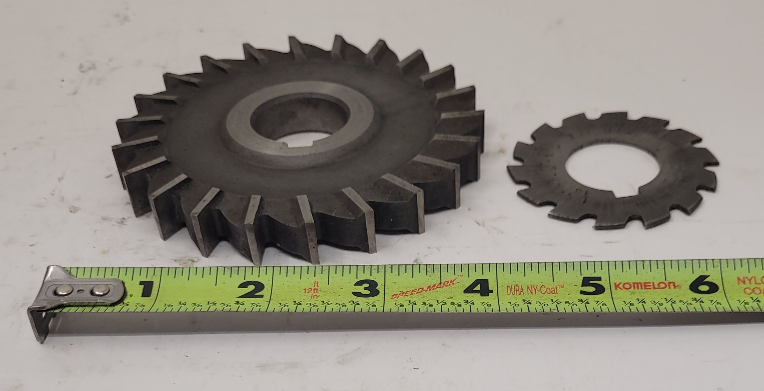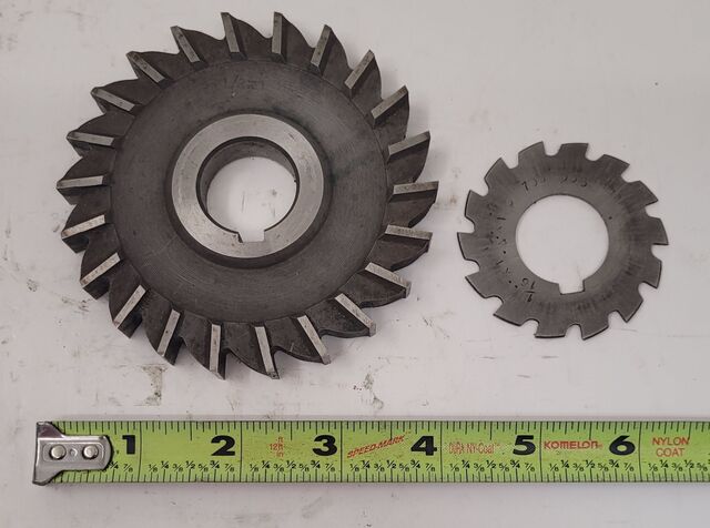 MSC HHS Straight Mill Slitting Blade set of 2 by MSC Industrial Supply. Includes a 4 diameter with 22 teeth and a second 2.125 diameter with 14 teeth. Both fit 1 arbor and vary in thickness. Used condition for precision tooling needs.