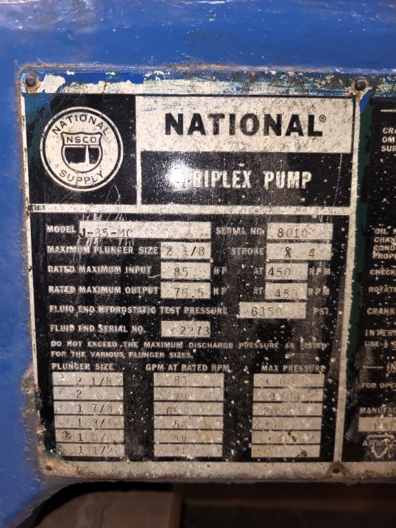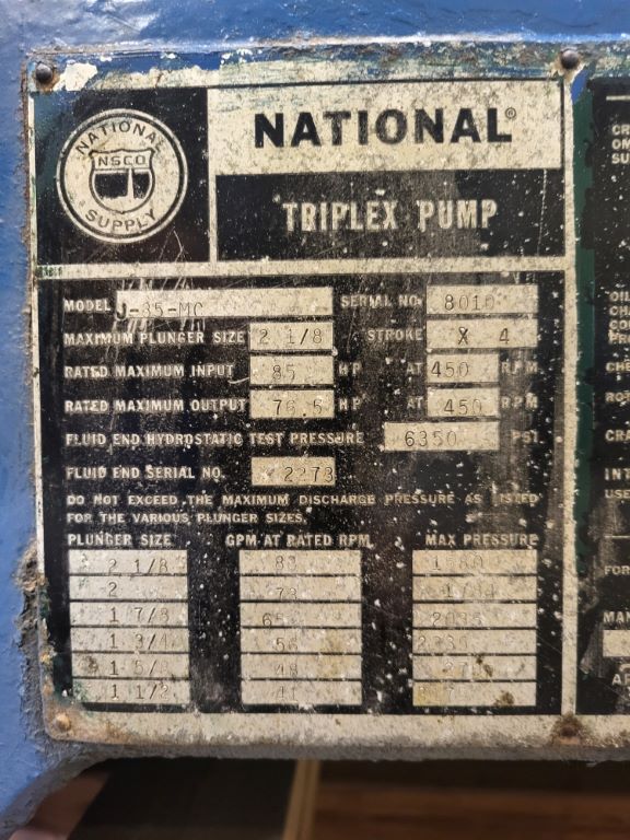 | Description: | Used National J-85 MC triplex pump with the following features: • 4" stroke • 85 HP • Aluminum bronze fluid end • Missing plungers (pump takes 1.5-2.125 plungers) • No valves • 2" suction connection details • 1.5" connection details • Weight: 440 lbs. • Dims: 52"(L)x 51"(W)x20"(H) |