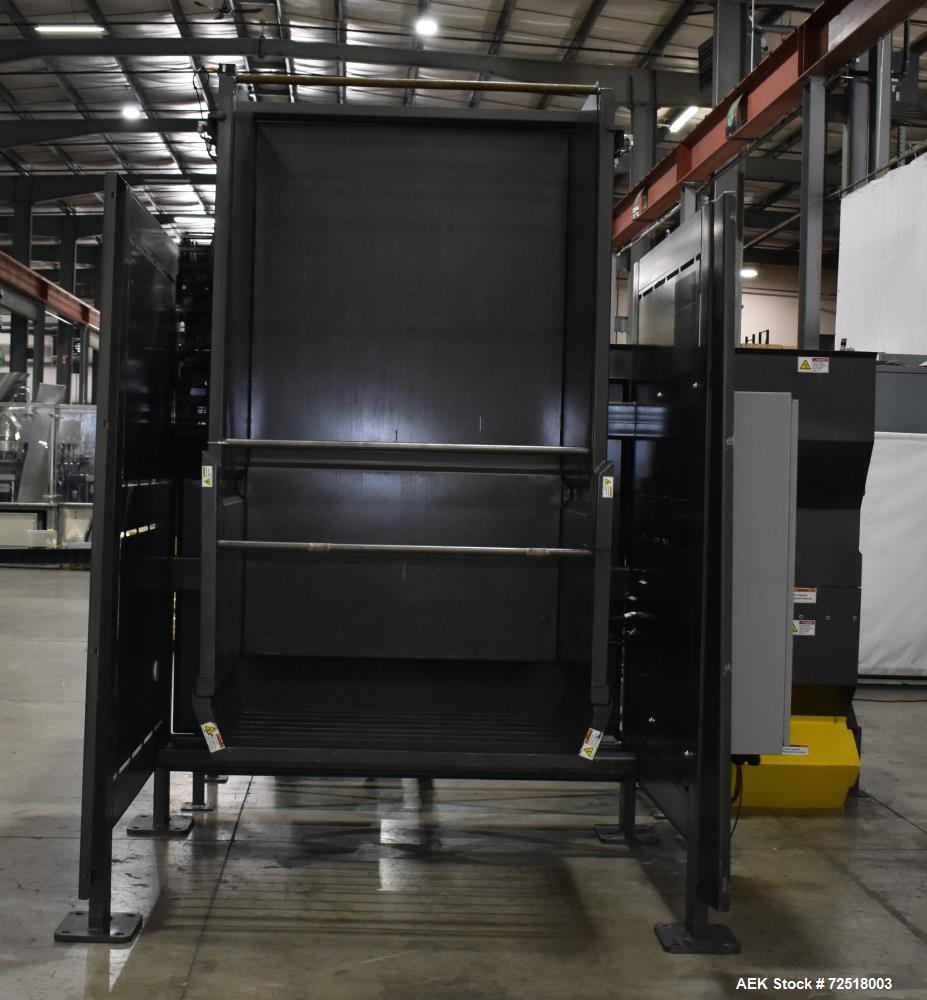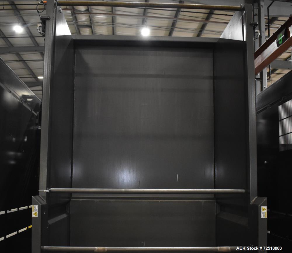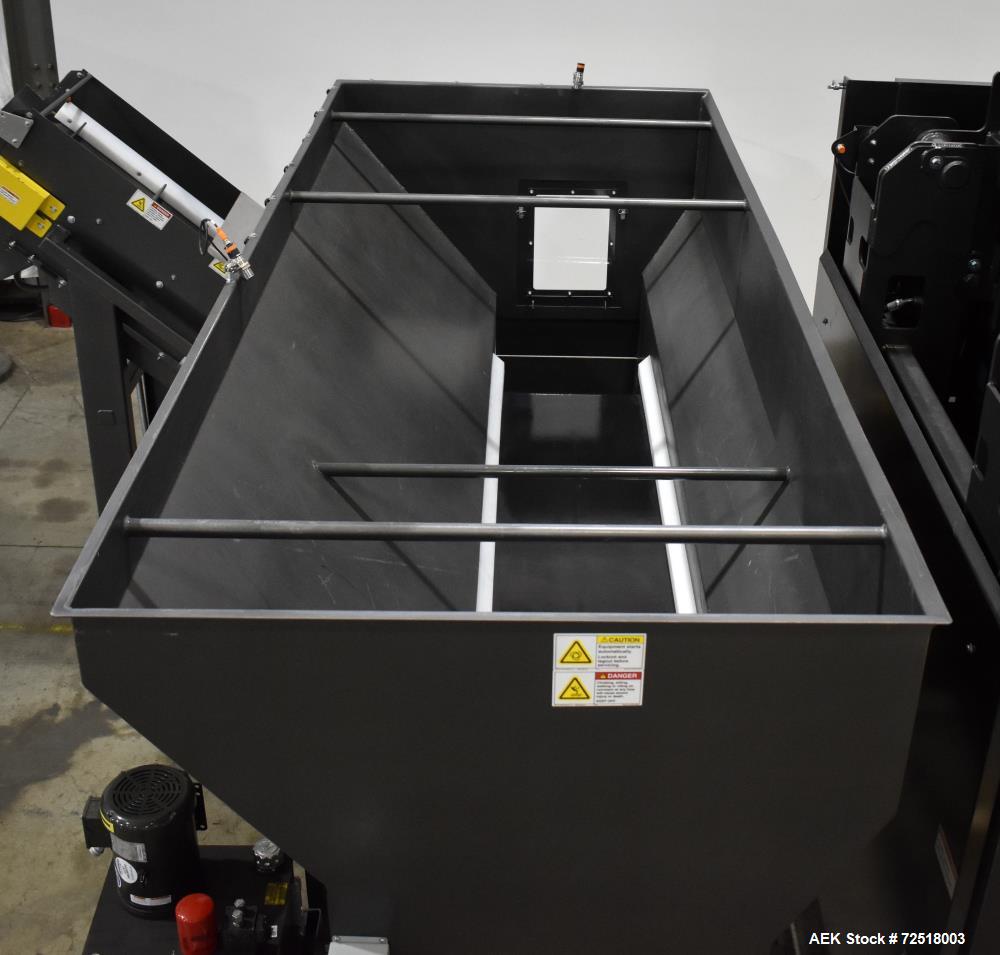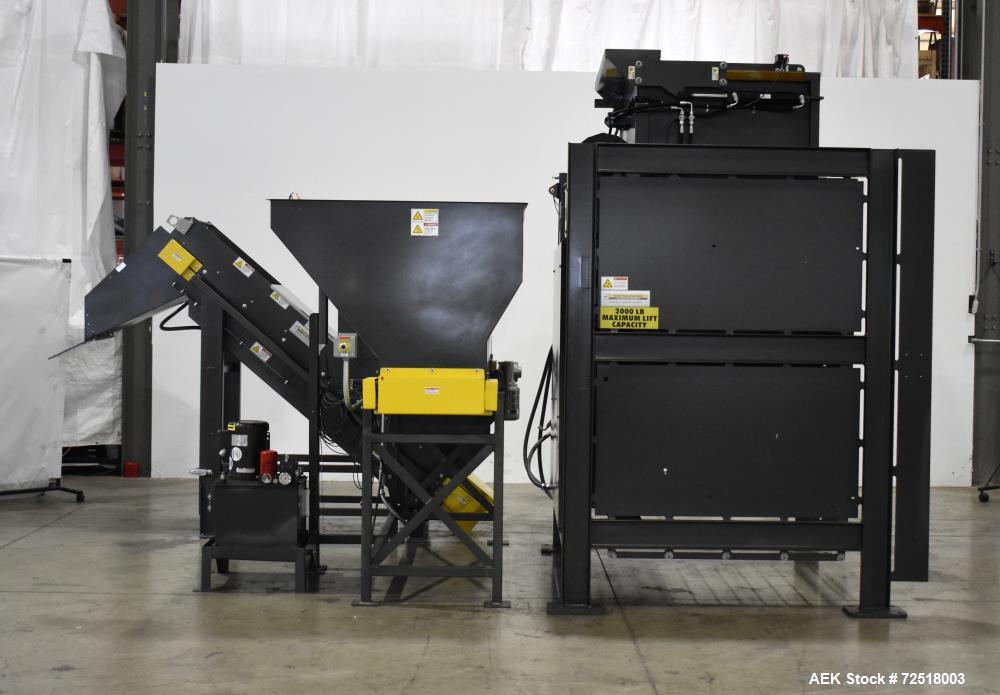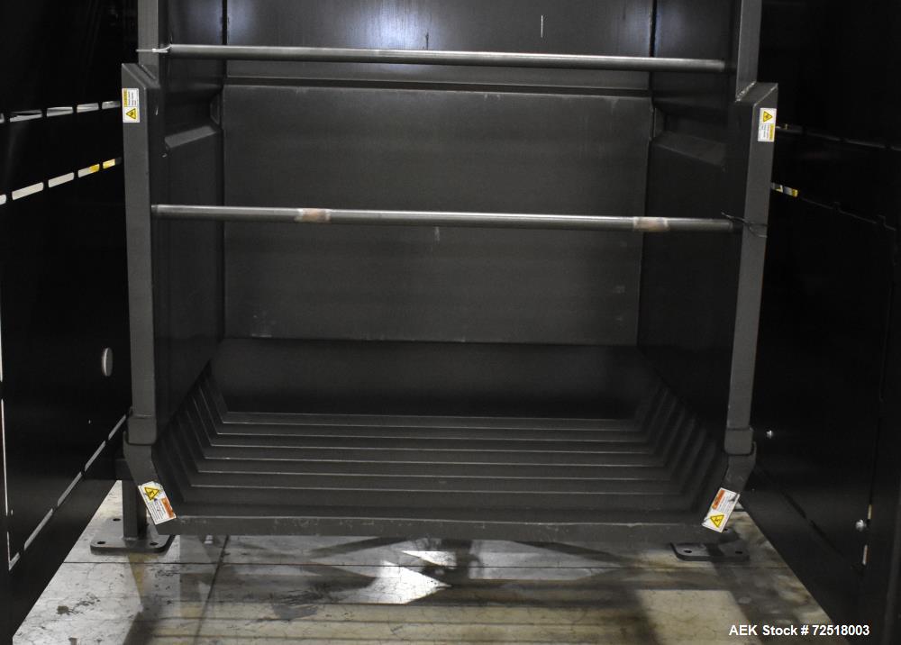 used- nbe bulk equipment tote / gaylord container discharge unloading system. designed for plastic bulk tote, 45" x 48" x 25" tall and 34" tall. container case approximate 35" wide x 50" long x 93" tall. load height 24", 135 degrees of rotation. hydraulically operated tilt, with 5hp hydraulic unit. bucket dimensions 50" wide x 56.653" deep x 94.288" tall, adjustable height retainer bar. control panel with allen bradley compactlogix l18er plc, a/b panelview plus 7, a/b powerflex 525. includes infeed powered roller conveyor, hopper approximate 129.5" x 53.075" x 42.25" tall with 20" wide x 133.49" long black pvc belt conveyor, 19" usable width. incline cleated belt conveyor, 20" wide black pvc cleated belt with lacing, 14" long cleat area, 19" usable width, discharge height 51.594" tall. 3/60/460 volt, 60 amp.
