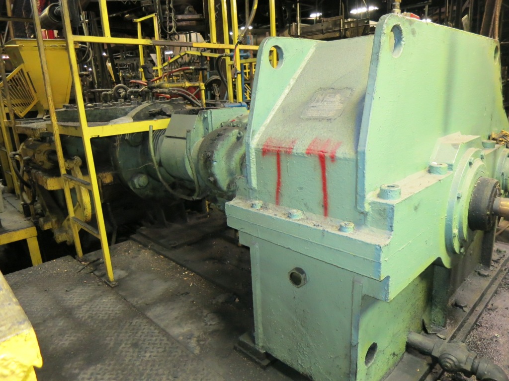 One (1) used NRM 6" x 10 Duplex Hot Feed ROLLERFEED tread extruder, opposed head, NRM 10" with 27:1 gearbox ratio, WITHOUT 6" EXTRUDER, duplex opposed head, no motors, no base, removed from service due to plant closure