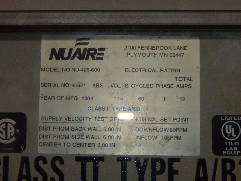 NuAire #NU-425-600, Biological Safety Cabinet, 1.38 kW, 115 V