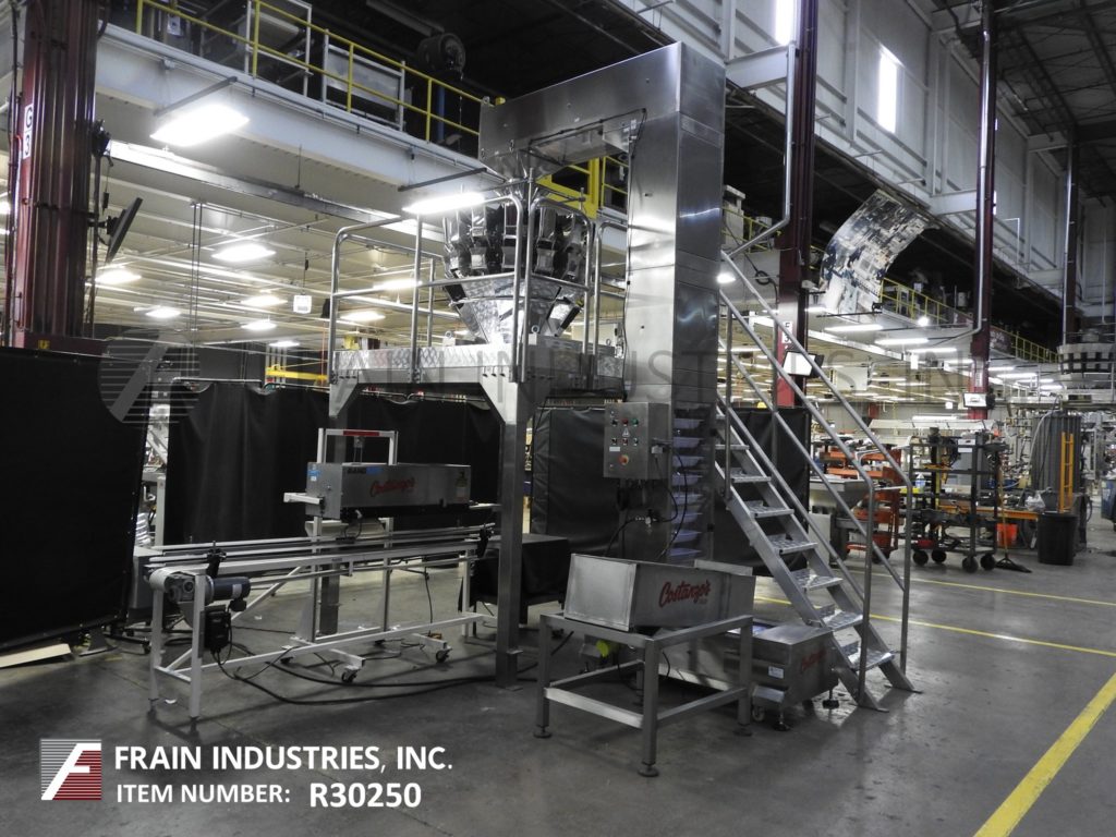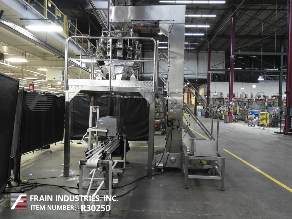Ohlson Packaging, complete combination weigh scale, bag filling system with number of bags per minute – depending on materials and application. Line consists of Ohlson stainless steel bucket elevator with 15" long x 4½" wide x 3½" deep plastic buckets and has 26" long bottom feed horizontal run, to 142" long vertical run, to 72" long top horizontal run with 150" discharge height into the Ohlson 14 head stainless steel combination weigh scale system with strain gauge load cells, dimpled product buckets and has a weight range from 25 to 500 grams with accuracies of ± 0.5 grams, capacities from 500ml to 2500ml. Has product in feed funnel, with (14) 11½" long vibratory linear feed pans to (14) 6" long x 4¾" wide x 9" deep feed buckets, to (14) 6" long x 4¾" wide x 9" deep weigh buckets and 10" wide x 30" long product collating discharge chutes. Mounted on 78" x 78" stainless steel platform with stair access and safety rail guarding