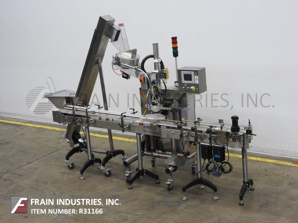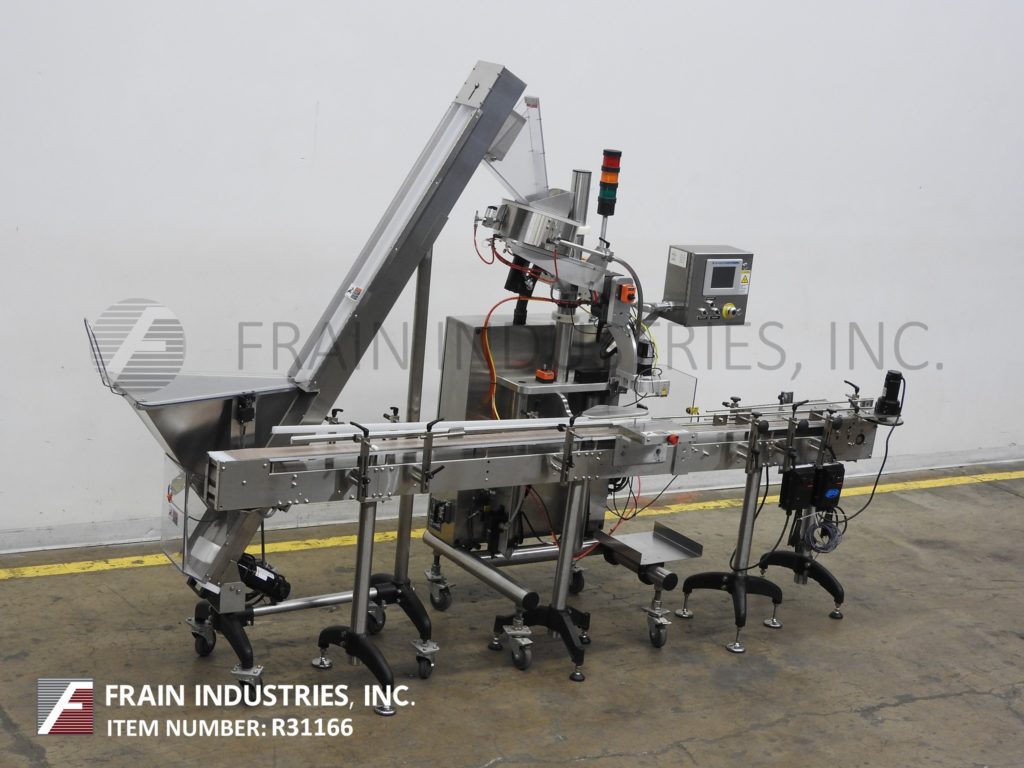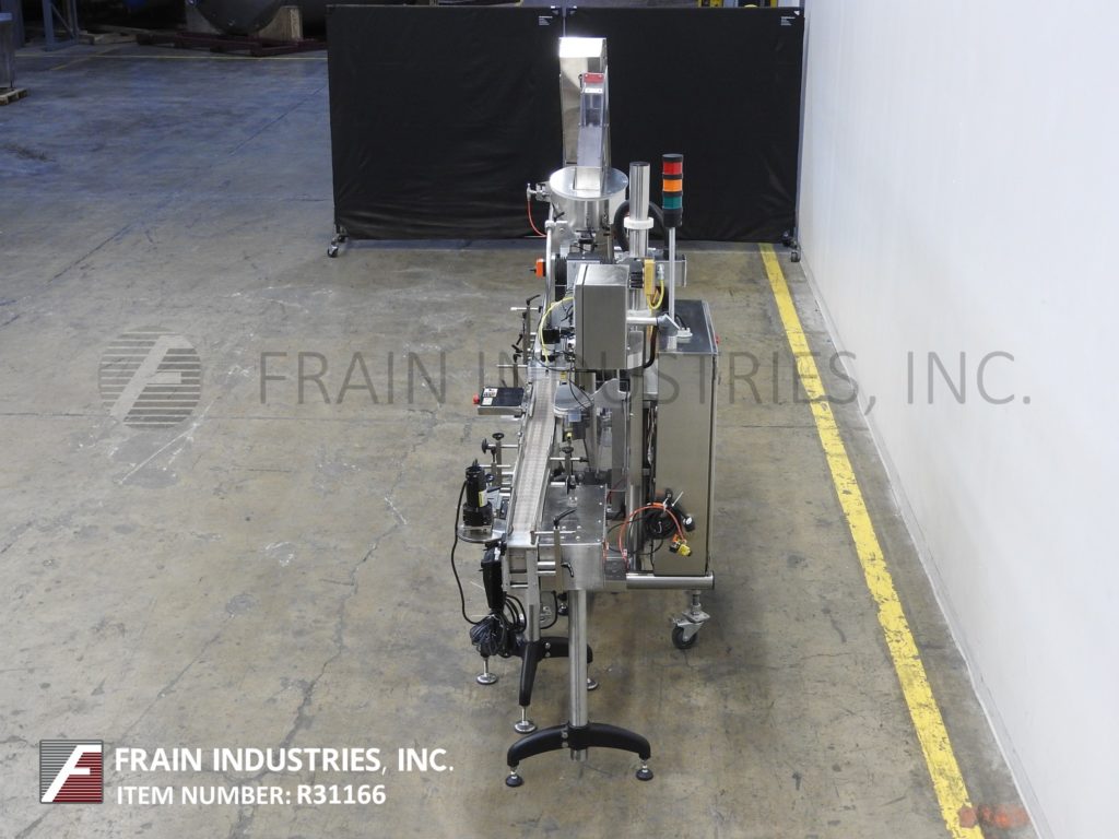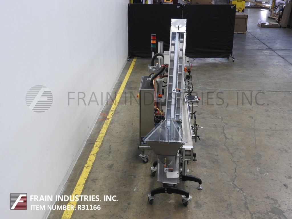 Omega Design, Model CDFR-1D1, in line canister style desiccant despenser with incline cleated belt feeder and container conveyor rated from 50 to 400 single drops and 50 to 300 double drops per bottle per minute – depending on materials, application and desiccant design and is capable of feeding 1 to 3 gram desiccants into containers single or multiple drops per bottle with proper change parts. Stainless steel construction. Equipped with stainless steel container conveyor with 120" long x 4-1/2" wide plastic delrin belt with bump wheel discharge, 24" long x 21" deep desiccant feed hopper with plastic flip up cover, 72" long x 2" wide inclined cleated feeder with continous rotary feed conveyor belt with 2" high cleats set on 5" centers and plastic cover with 70" discharge height. 12" OD desiccant sorting disc, with 3/4" wide desiccant canister tube dispenser with spacing belt and product counter. Control panel has A/B PLC controller and A/B PanelView controls with elevator, pre-orienter, spacing belt control drives with variable speed controllers and statis light bar. All Mounted on stainless steel base frames.