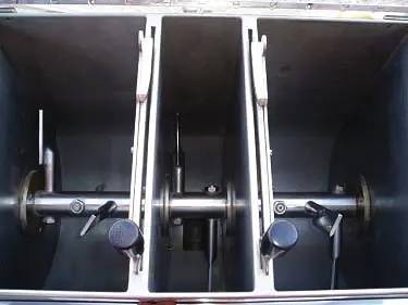Pama Roma Extruder. 3-compartment blender for efficient batch transfer. Outside compartments min/max capacity: 275/804 cu. in. Middle compartment min/max capacity: 53/154 cu. in. Number of paddles: 10. Paddle dimensions: 3 in. L x 1-1/2 in. W. Extruder diameter: 4 in. Number and size of perforations: (30) 1/8 in. dia. Mezmohelnice Motor, 1.1 kW/1.5 hp, 1,410 rpm, 380/220 V, 2.8-4.8 amps. Bonfiglioli Motor Drive, 1:23 ratio, 74.34 rpm (final). Inlets: (1) 19-1/2 in. L x 12-1/2 in. W infeed, (2) 1/4 in. dia. barb fittings (vacuum), (2) 4 in. W x 2 in. H side entry doors. Outlets: Extruder. Overall dimensions: 26 in. L x 25 in. W x 58 in. H.