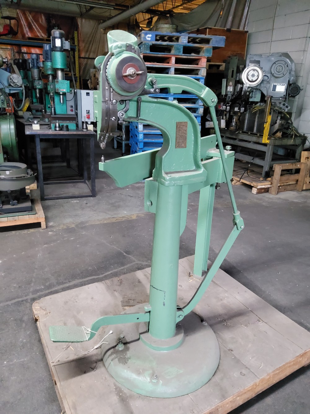 Stimpson R1 Foot Powered Rivet Machine, Inventory # 8955, Model: R1, S/N: 4892709F, Can set up to a #0 Grommet, Entry level for light to medium duty workload, Throat Depth: 4 3/8″, Height: 48 1/2″, Weight: approx. 120 lbs., This Machine Manufactures:, – Eyelets, – Grommets, – C-E Rivets ...more