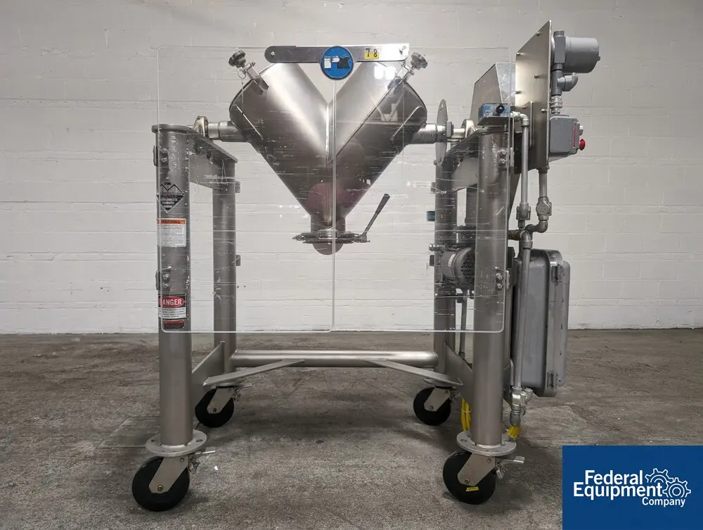 Used approximately 8 quart working capacity plexiglass twin shell blender. Chain driven through gearhead motor. On stand. Includes most cover parts. Manufactured by Patterson Kelley. Mounted on a portable table., PATTERSON-KELLEY 8 Quart, Capacity. 2 gal, Material of construction. Plexiglass, Type (Double Cone/Twin ...more