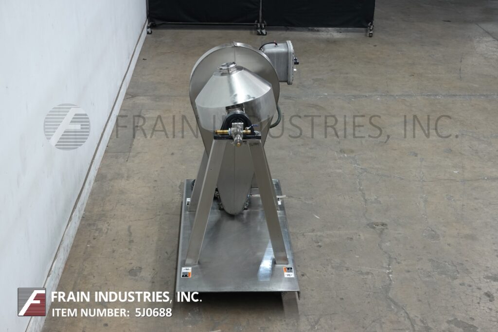 Paul O Abbe, 1.7 ft³, total 1.2 ft³ working capacity stainless steel, roto cone blender with the number of pounds of product per hour – depending on materials, application and machine configuration. Equipped with 24" high cone shell with 10" top and bottom slants and 7" straight wall, with 5" OD top product port with clamp down cover and 7" OD discharge valve with 32" floor clearance, chain and sprocket drive has safety guarding and controller with start, stop push buttons. Mounted on (4) legs with forkable platform.