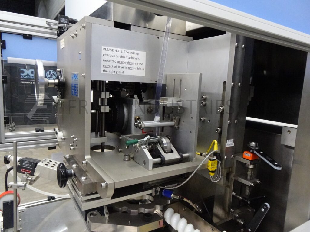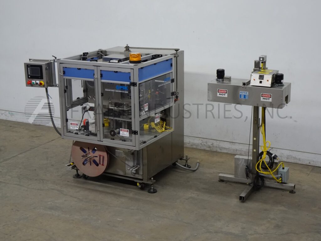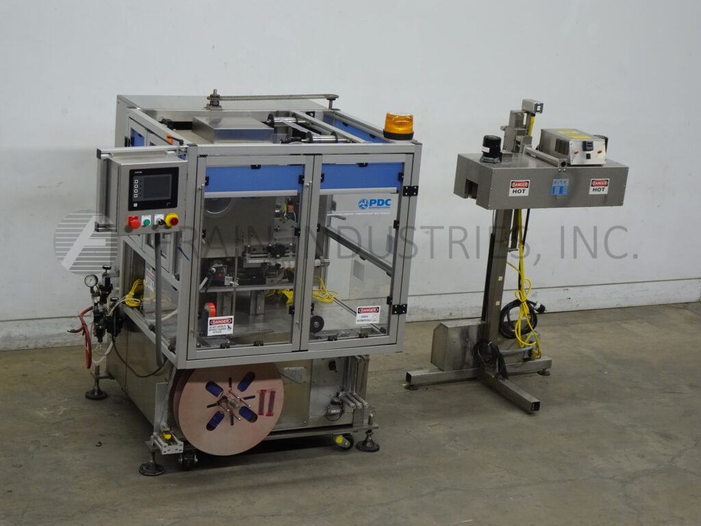 PDC, Model 75-M-ID, automatic shrink sleeve labeler and tamper evident neck bander. Rated up to 400 containers per minute – depending upon materials, application and machine configuration. Band Diameter: 0.375" to 3.5", Band height: 0.625" to 9". Equipped with 12" long product in feed worm screw, star wheel container indexing, 22" OD band reel low material / no band sensors and 36" long hot air tunnel with a 5" wide x 4" high aperture. Control panel has an AB controller and touch screen HMI.