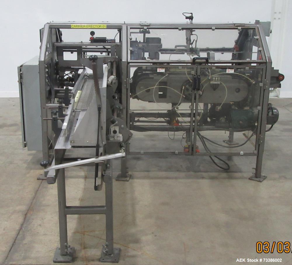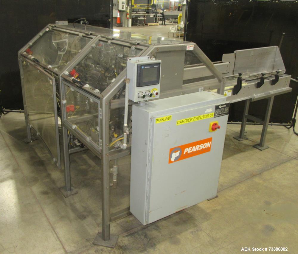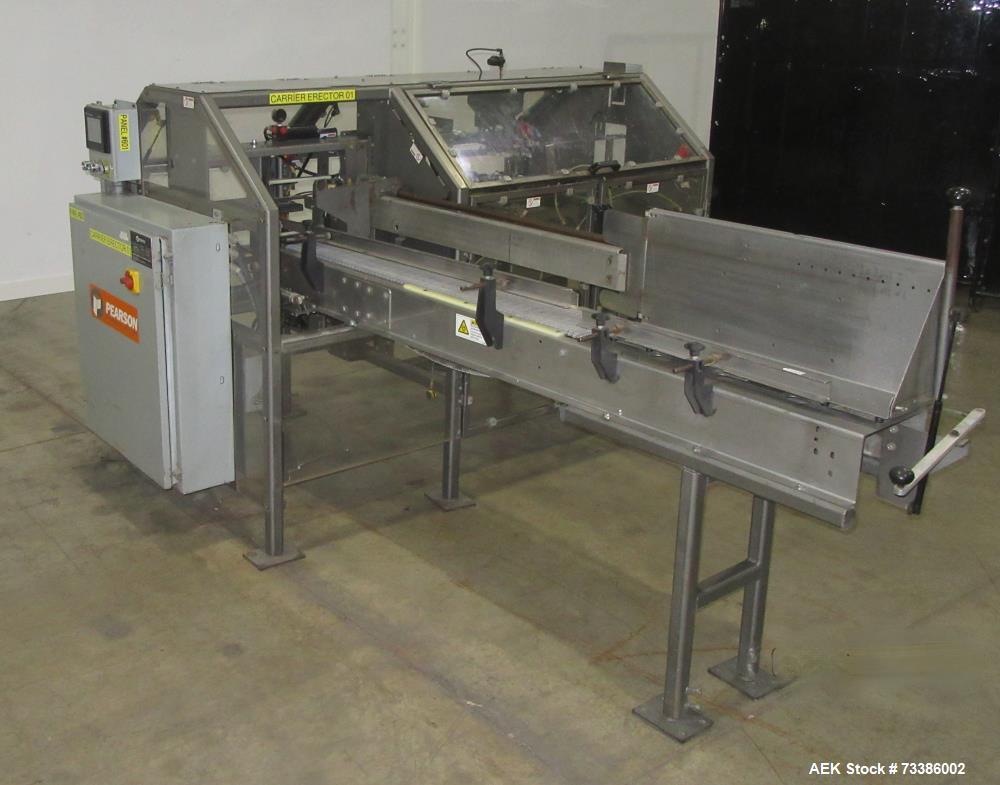 used- pearson carrier erector, model dx150. capable of up to 150 carriers per minute (depending on carrier). erected carrier size range: 6 pack erected (length) 7.31" 7.97" (width) 4.88" 5.50" (height) 6.25" 9.50". 4 pack erected (length) 4.88" 5.50" (width) 4.88" 5.50" (length) 6.25" 9.50" - case size range: (length) 14.25" 16.5" (width) 8.75" 11.5" (height) up to 16" (includes flap). control panel with allen bradley panelview 600 hmi, a/b micrologix 1500 plc, a/b powerflex 4 drive. serial# 2006dx1510937. 3/60/460 volt.