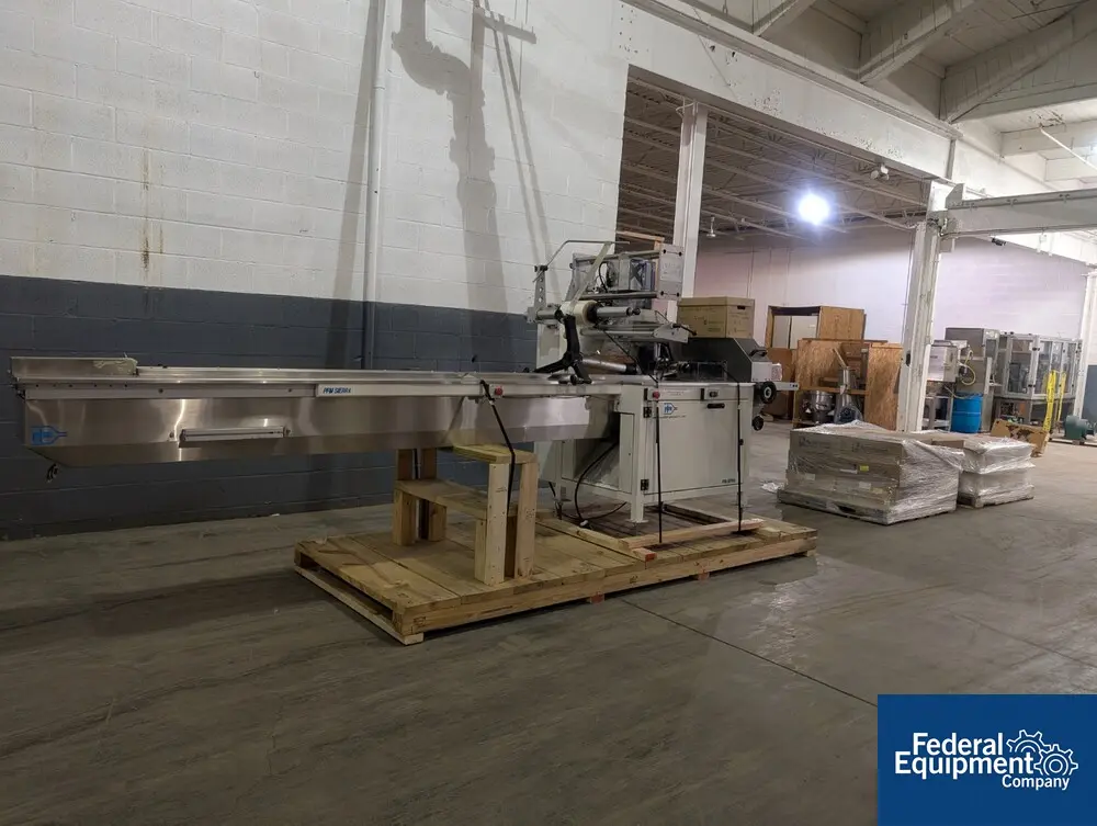 Used PFM Packaging Machienery horizonal flow wrapper, model SIERRA, stainless steel construction, with integrated heat sealer, Markem printer, with touchscreen controls, 220 volts, serial# 028899.