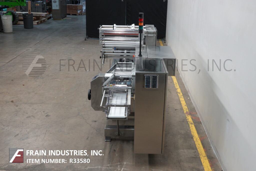 Pfm Falcon, 2-up, servo driven, horizontal flow wrapper. Product size range: 1.6″ to 18″ in Length; 3/8″ to 9″ in Width; up to 3.9″ in Height. Equipped with 96″ product load area with 1” high quick change lugs, adjustable former, (3) sets of fin seal wheels 2-up, 9.8″ wide x 1″ thick seal jaws and 36″ long powered discharge conveyor. Additionally features film registration, no product / no pouch and interlock safety guarding. Film specifications up to 23.6″ reel width; up to 13.7″ reel OD; on 3″ OD core. Has (2) film rolls (1) for extra film roll no splice station. PLC controls with HMI. Mounted on leveling legs. Rated from 50 to 200 products per minute. Speed and product size range dependent on materials, application and machine configuration.
