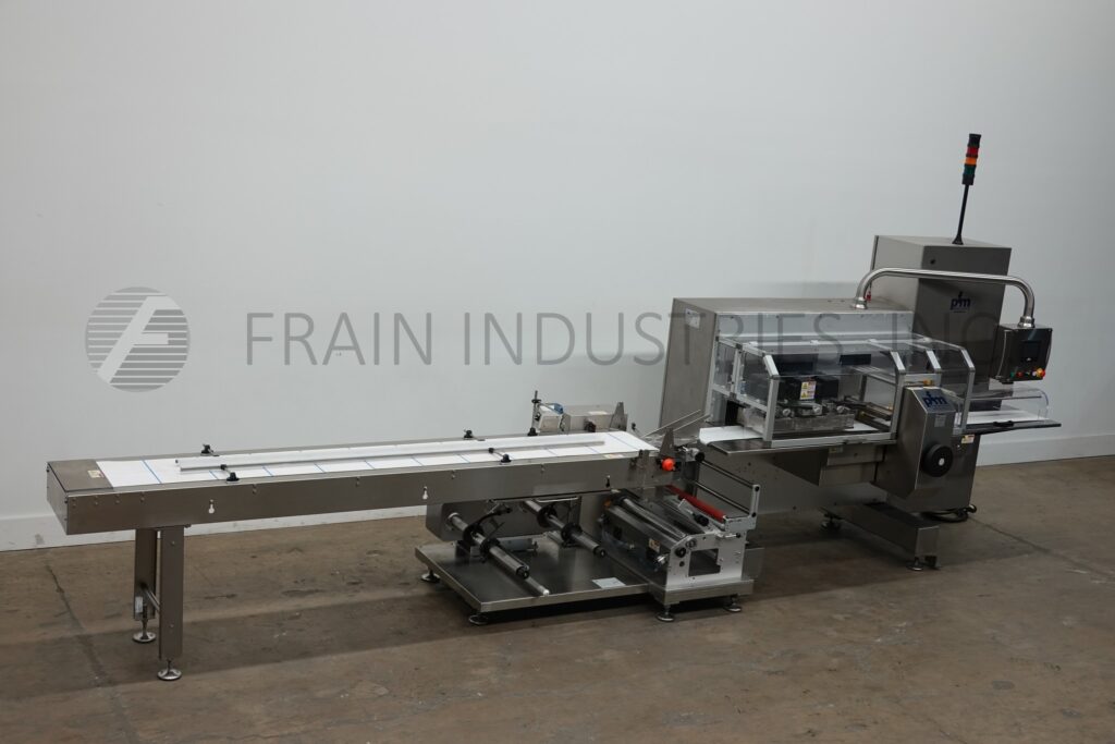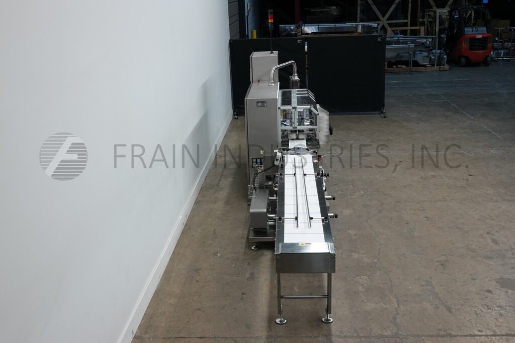 Pfm Model Falcon BB, Automatic, inverted, 2-up, (3) axis, servo driven, horizontal inverted flow wrapper rated from 50 to 200 products per minute – depending on materials, application and machine configuration. Product size range: 1.6" to 10" in Length x; 3/8" to 9" in Width; up to 3.9" in Height standard. Equipped with 114" long x 13¾" wide belt in feed conveyor and 92" long load area, no product / no pouch, with adjustable forming box, 2-up, 9.8" wide x 1-1/4" thick seal jaws and (3) sets of fin seal wheels, 1st set to pull the wrapping material, 2nd set to produce the longitudinal seal, 3rd set to fold the wrapping material has interlock safety, Film specifications up to 23.6" reel width; up to 13.7" reel OD; on 3" OD core. Has (2) film rolls (1) for extra film roll no splice station and 36" long powered discharge conveyor. Control panel has PLC controls with touch pad controller and readout, crimper jaws and fin seal temperature controllers, power, heaters and run, jog on / off switches start, stop and e-stop push button controls and statis light. Mounted on stainless steel frame with leveling legs.