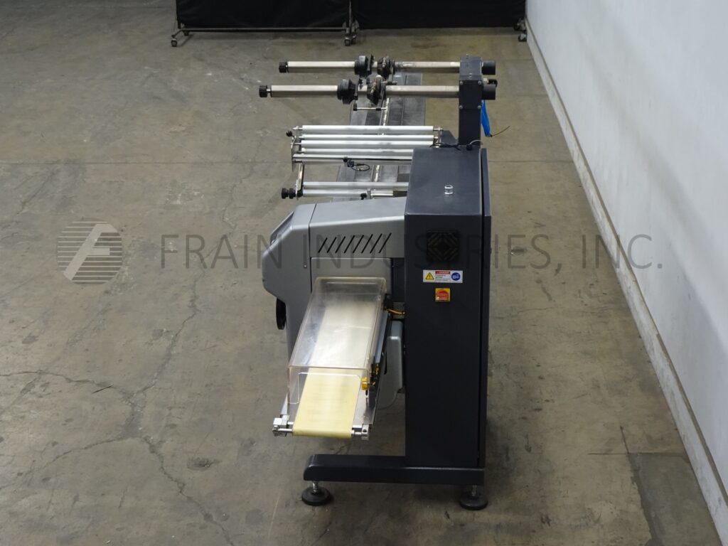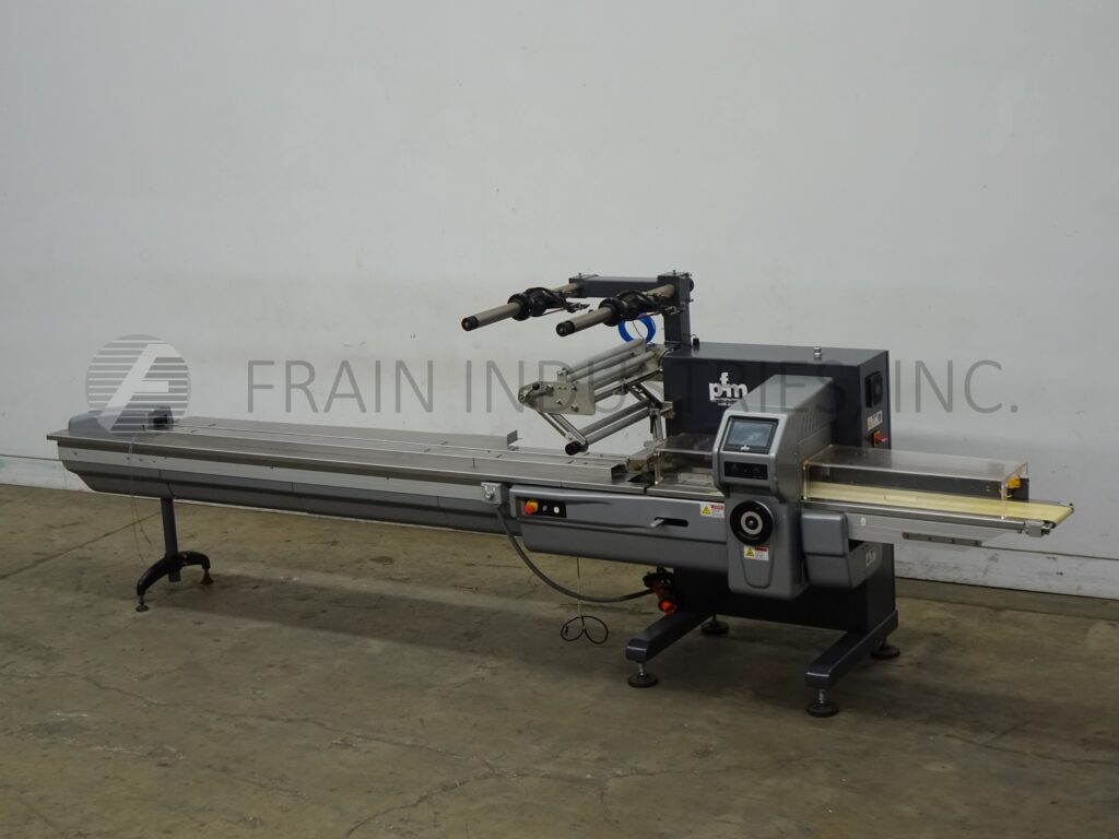 Pfm, Model Pearl, 2-up, automatic, 3 axis, servo driven, horizontal flow wrapper rated from 30 to 160 cycles with number of products per minute – depending on materials, application and machine configuration. Product size range: 1.6" to 18" in Length; 3/8" to 8.8" in Width; up to 4" in Height with proper change parts. Equipped with 72" long operator load area, with 1" high quick change plastic lugs currently set on 6" centers, adjustable former and has 2-up, 8.8" wide x 1-1/4" thick seal jaws and a set of fin seal wheels. Interlock safety guarding and 40" long x 8" wide discharge conveyor with 24" floor clearence. Film specification up to 24" OD in width; 14" OD reel, on 3" OD core. Control panel has PLC controller with touch pad controls and readout and e-stop. Mounted on (6) leveling leg frame.