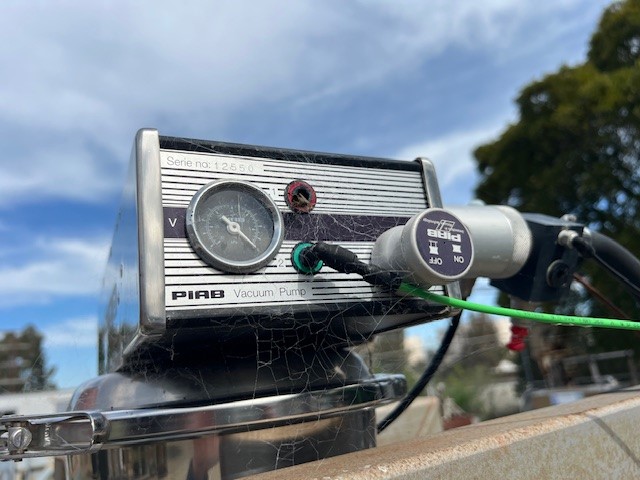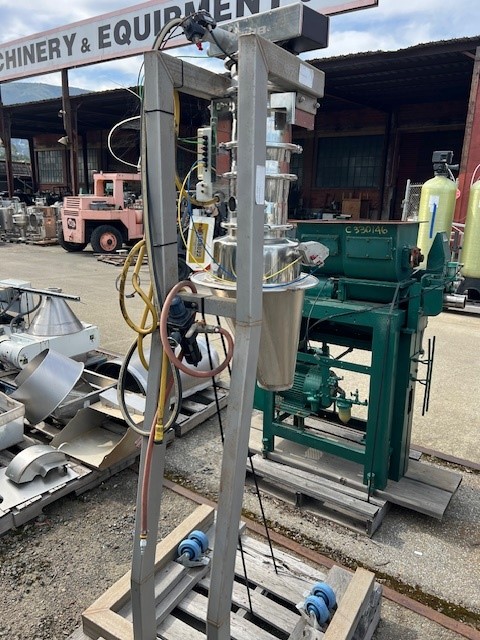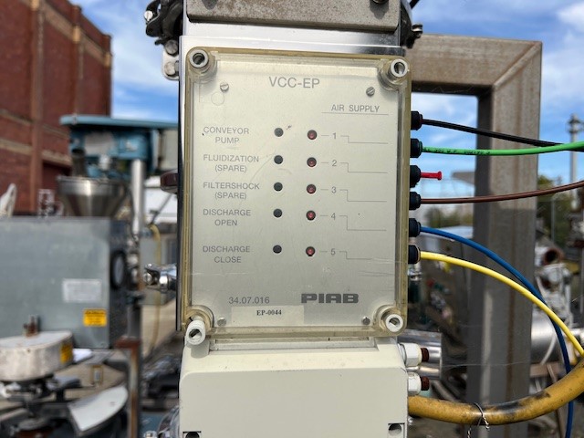 Piab Volumetric Filler - Volumetric stainless steel filler with an 8" diameter x 16" high filling section, 5" outlet, 2" feed inlet, and integrated vacuum pump. Mounted on a portable frame with casters.