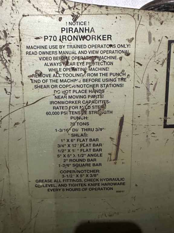 PIRANHA P70 70TON HYDRAULIC IRONWORKER equipped with: