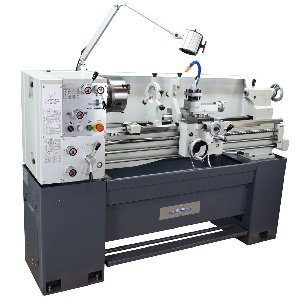 Precision Matthews PM-1440GT Ultra Precision Lathe Manufacturer: Precision Matthews Model: PM-1440GT Year: 2025 Stock # PM-1440GT Price: $12,999 USD - Finance for as low as $264/mth Estimated monthly payment valid upon approved credit. Request Info 10 For Sale by Precision Matthews Machinery Co Surplus Record Dealer Since 2024 Contact Seller Coraopolis, PA Sales Dept. 412-78...> Show Seller's Phone Number 412-787-2876 Let the seller know you found their listing on Surplus Record! View More Precision Matthews Machinery Co 's ListingsDescriptionMain Specifications PM-1440GT: Dimensions, approximate overall, incl. standWidth 70 in. x Height 47 in. x Depth 29 in. (full range cross slidemotion)Footprint: 68 in. wide x 16-1/2 in. deep (Base Footprints: Headstock Base is 16.5 D x 14.25 W, Tailstock Base 16.5 D, 11.125 W, and 42-5/8″ between the bases)Bed length, excluding headstock: 51 in.Spindle centerline to floor: 43 in.Weight, approximate:1750 lb netMotor TEFC type, 1725 rpm, optional 2 HP 1Ø or 3 HP, 3ØHeadstock center to tailstock center 40 in. maxSwing over bed 14 in. diameterSwing over cross-slide 8-3/4 in. diameterSwing over gap 20-3/4 in. diameterGap insert length 7-3/4 in.Spindle face to gap end: 5-1/2 in.Spindle face to tailstock quill face 44 in. maxSaddle travel 36-1/4 in.Cross-slide travel 6-1/2 in.Compound (top slide) travel 3-1/2 in.Spindle Speeds:Low range, rpm 50, 70, 95, 140Mid range 180, 250, 340, 510High range, rpm 700, 980, 1350, 2000Carriage drive, thread cutting Leadscrew 8 tpiInch threads Choice of 36, from 3 to 56 TPIMetric threads Choice of 34, from 0.4 mm to 7.2 mm pitchLongitudinal Feed rates from 0.0026 to 0.0368 in./spindle revCross Slide Feed Rates from 0.0013 to 0.0184 in./spindle revSpindleChuck/faceplate attachment D1-5 CamlockInternal taper MT5-1/2Spindle bore 2 in. diameter (slightly over, will pass a 2.000″ piece)Spindle length, LH end to chuck mounting face 15-1/2 in. overallSpindle length, LH end to chuck face (typical) 19-1/2 in. approx.TailstockInternal taper MT3Quill travel 4 in.Work holdingCenter rest (steady rest) capacity Up to 3 in. diameterFollower rest capacity Up to 1 in. diameterCountry of Origin: TaiwanPower requirement: 208 to 240 Vac, 60 Hz, 1 or 3 phase (Choose phase option when purchasing, both recommend a 20A Circuit)Power connection type: Direct wire in to electrical cabinet in rear of machine, directly behind headstockMain Features:Highest Quality Lathe, Made in TAIWANLarge 2” Spindle Bore clear through spindle for through-headstock workShort Spindle Length, only 15-1/2″, perfect for gunsmithingworkPower feed on Carriage, and Cross Slide, both left and right,and in and out, for both turning and facing operations withautomatic feed. Allows for the best surface finish in alldirections.Induction Hardened and Precision Ground Bed Ways toresist wear and give a long service lifeAll gears and shafts in headstock hardened and precisionground for long life and extremely quiet runningFC-25 Meehanite Cast Iron used for rigidity and vibrationdampeningRemovable Gap for larger diameter workHigh quality electronics used throughout machineSlip Clutch on feed rod, to help prevent overloading damageof feeds and allow the use of a solid micrometer carriagestop for repetitive workHigh Precision Tapered Roller Bearings used in spindle, for theultimate in long life, high precision, and best surfacefinishes. Guaranteed Run Out +/- .0001″ for ultimateprecisionInch AND Metric thread cutting ability is a standard featureTrue INCH PITCH main lead screw, cross feed, andcompound lead screws make it easy to use for the INCHmeasurement System, yet still has the Metric readings ondials for the ultimate in versatility for any job that may comeaboutSplash oil bath lubrication in Headstock, and Apron, forefficient lubrication, and long life, yet simple and reliable,maintenance as with oil pump lubrication systems. Also norisk of losing oil flow to expensive parts as there can be withpump lubricated systemsOnly Extremely High Precision Japanese Spindle Bearingsare used, NACHI Brand at this timeLocking Tang in tail stock is providedLongest in the industry, 5 Year Warranty!Standard Accessories:Complete Base with Chip TrayL.E.D. Work LightNACHI (Japan) Spindle bearings, with +/- .0001″ Max Spindle RunoutD1-5 Quick Change Spindle MountBack Splash GuardReducing Sleeve for Headstock Center4 Way Tool PostHeadstock Dead CenterTail Stock Dead CenterThread Chasing Dial (4” Travel Thread Dial, for easier inch thread cutting)Feed Rod Clutch (To prevent overloading and using carriage stops)Everything Needed for listed Inch and Metric Thread PitchesSteady RestFollow RestCoolant SystemFoot BrakeBelt Cover Interlock SwitchD1-5 Face Plate (12″ Diameter)(6) Pcs Cast Iron Leveling Pads with Bolts5 Year Warranty*Note, chucks are not included standard, please select chuck option from the optional accessories if you need a chuck with your machine Request More Information from SellerInquire Further with Precision Matthews Machinery Co! "*" indicates required fieldsName*Company*Email* PhoneZip / Postal Code*QuestionMake an OfferRequests Send me a shipping quote I am interested in financingSend Copy Email me a confirmation of this inquiryBuyer Protection Use our partner Escrow.com to buy or sell equipment safelyBuyer Protection Send me info about buyer protectionThis field is hidden when viewing the formDealer Email Buyers Who Viewed This Listing Also Viewed … Hardinge, precision turret lathe, serial #1755-1, #16101Category: Precision and Second Operation LathesSeller: Yoder Machinery SalesLocation: Holland, OH Mfr: HardingeSERIAL #. 1755-1. Schaublin #13, Precision Toolroom Milling, 8.5" x 26" Table, 60" H x 45" width x 36" depth, 550 VCategory: Precision and Second Operation LathesSeller: MachineCoLocation: Montreal, QC Mfr: SchaublinModel: 13“Normal wear from use, always well maintained!”, Milling, Schaublin model, 13 Precision, universal, tool roomAlways well maintain