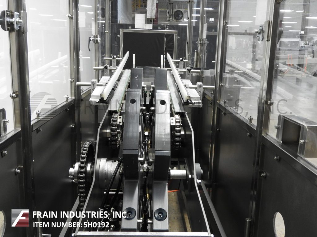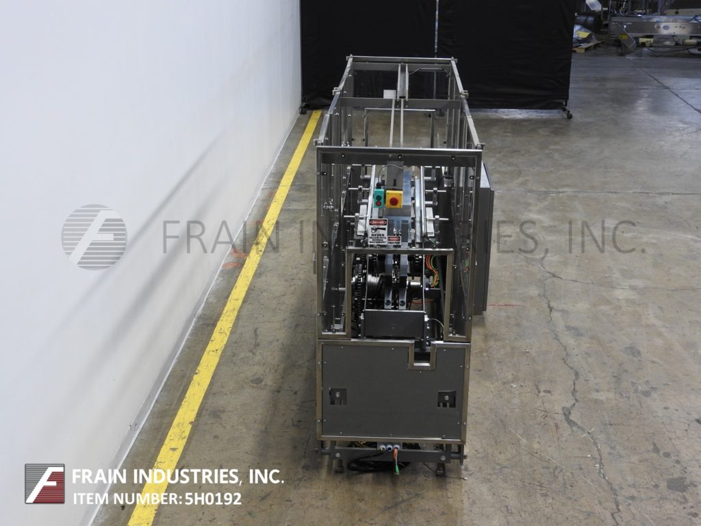 PMI Cartoning, Model 96200800, inline, servo controlled carton upender. Rated from 20 to 300 cartons per minute – depending on materials, application and machine configuration. Equipped with 28" diameter up ending star wheel with vacuum suction cups and a 45" long (2) chain lugged take away conveyor set on 9" centers. Control panel with independant servo controllers for starwheel / lugs and push button stop / stop controls. Mounted on base frame with safety guarding.