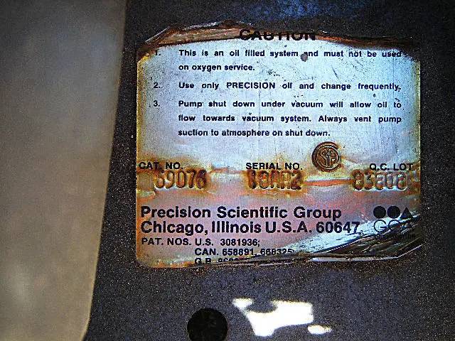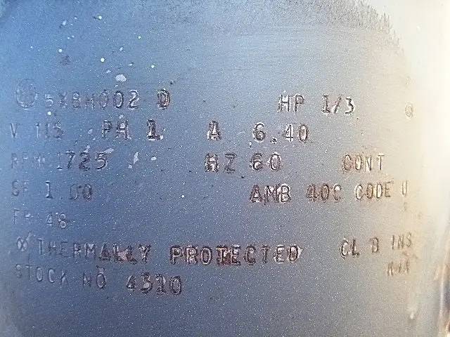 Precision Vacuum Pump - 2.65 CFM. Motor: General Electric motor. 1/3 hp, 1725 rpm, 115 V, 6.40 amps, 60 Hz, 1 phase. Inlets/outlets: (1) in. dia. port. Overall dimensions: 1 ft. 4 in. L x 1 ft. in. W x 1 ft. H.