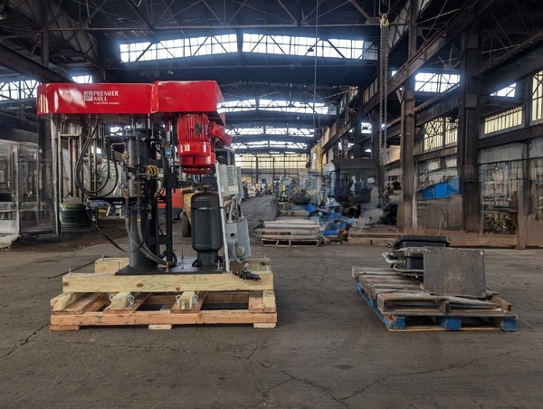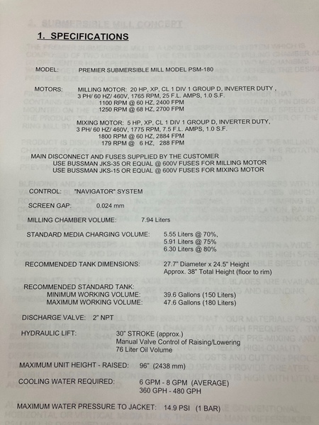 Used Premier Submersible Basket Mill, model PSM-180, stainless steel shafts, with submersible basket mill driven by 20 hp, 460 volt xp motor, dual 4 blade turbine mixing shafts driven by 5 hp, 460 volt xp motor, Navigator XP controller system, floor mounted with air over oil hydraulic lift with air tank, serial# ...more