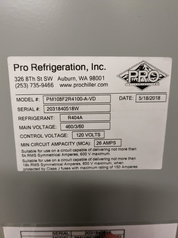 Pro Refrigeration #PM108F2R4100-A-VD, chiller, air cooled condensor, 9 HP compressor, 2018 Manufacturer: Pro Refrigeration Model: PM108F2R4100-A-VD Year: 2018 Stock # C745095 Request a Quote 3 For Sale by Machinery & Equipment Co Surplus Record Dealer Since 1969 Contact Seller Brisbane, CA Dominic Piazza 415-64...> Show Seller's Phone Number 415-649-9611 Let the seller know you found their listing on Surplus Record! View More Machinery & Equipment Co 's ListingsDescription Pro Chiller MA Series Chiller, with 9 HP compressor, air cooled condenser, manufactured by Pro Refrigeration, Inc., Model PM108F2R4100-A-VD, Serial number 2031840518W, manufactured in 2018. Unit designed for R404A refrigerant. Rated for 3-phase, 60 Hz, 460 V, with 120 V controls. Includes 1 HP circulation pump and 1 HP process pump, 2" glycol connection. Features electronic temperature control with digital display.Basis: As Is, Where Is Request More Information from SellerGet Your Price from Machinery & Equipment Co! "*" indicates required fieldsName*Company*Email* PhoneZip / Postal Code*QuestionMake an OfferRequests Send me a shipping quote I am interested in financingSend Copy Email me a confirmation of this inquiryBuyer Protection Use our partner Escrow.com to buy or sell equipment safelyBuyer Protection Send me info about buyer protectionThis field is hidden when viewing the formDealer Email Buyers Who Viewed This Listing Also Viewed … Prelert / Prevac Plus #Pad-480-LP chiller pressure alarm / leak preventionCategory: ChillersSeller: Equipment Recovery CorpLocation: Willoughby, OH Mfr: PrelertModel: PAD-480-LP Ryan Herco Alcohol ChillerCategory: ChillersSeller: Federal Equipment CompanyLocation: Cleveland, OH Mfr: Ryan HercoUsed Ryan Herco alcohol chiller. Precision Heat Exchanger Co., Shell and Tube Chiller w/Surge Drum, 636 Tubes, 4162 sq.ft. heat transfer surface areaCategory: ChillersSeller: GenemcoLocation: Hearne, TX Mfr: Precision Heat Exchanger Co.Precision Heat Exchanger Co Shell and Tube Chiller with Surge Drum. S/N: 11796-1. Nat'l Bd: 5135. Tube material: SA214. Number of tubes: 636. Tube dimensions: 1-1/4 in. dia. x 20 ft. L. Heat transfer surface area: approx. 4,162 sq. ft. Tube volume: 518 gal. MAWP shell side: 150 psi @ 200 F. MDMT shell side: -45 F ...more Schrieber #50AC, water chiller, 115 V., 1 phase, 24.2 amps, 5 GPMCategory: ChillersSeller: Perfection GlobalLocation: Elk Grove Village, IL Mfr: SchrieberModel: 50ACChiller Capacity: 0.5 TonsCooling Rate @ 44°F: 6,000 BTU/hrReservoir Capacity: 20 US GallonsWater Pump Pressure: 24.8 PSIWater Pump Speed: 5 GPMElectrical  Volts/Phase: 115/1 - 230/1Control Voltage: 24 VoltsHertz: 50/60Amps: 24.2Water Pump Power: 1/2 HP. PolyScience #6260M11A110B, Chiller, R-134A, 1 Phase, 9.5 Amps, 120 VCategory: ChillersSeller: Quantum TechnologyLocation: Shippensburg, PA Mfr: PolyscienceModel: 6260M11A110B*Local Pickup Does Not Include any Palletization* PolyScience 6260M11A110B recirculating chiller designed for laboratory or industrial applications requiring precise temperature control, likely for cooling external equipment or processes., *Handling times for freight shipments average 5 days, but may vary depending on ...moreShare × "*" indicates required fieldsYour Name*Your Email* Recipient's Email* Note to Recipient