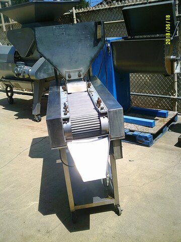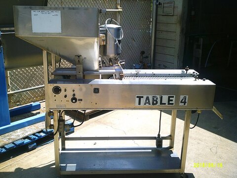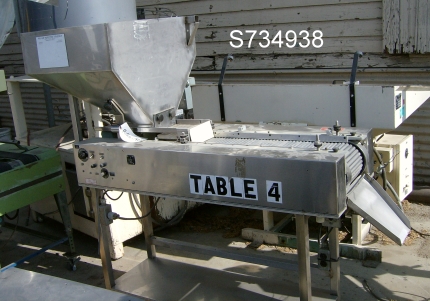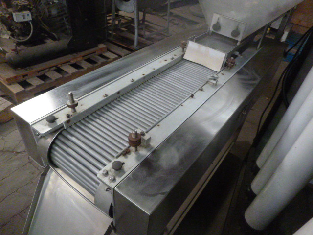 Capsule sorting inspection table, tablet sorter, manufactured by Production Equipment, Model IS-10, Includes 4 cu. ft. stainless steel hopper, leading to Syntron feeder measuring 7" x 21", with small dedusting section. Pills drop to sorting roller conveyor measuring 13" wide x 32" long. Unitized on stainless steel frame. Complete with vari-speed for roller, vibra feeder and conveyor, 115 volt. Serial number 77-147.