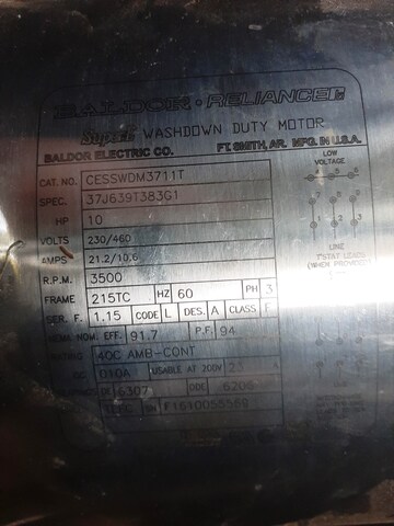 Tri Clover Pump. Model: SP218M-9237-35. S/N: W0926. Capacity: up to 300 gpm @ 70 psi and 170 tdh. Impeller diameter: 7 in. Seal option: double mechanical seals with water flush. Reliance Electric XE Motor, 25 hp, 3535 rpm, 230/460 V, 58.2/29.1 amps, 60 Hz, 3 phase. Pump is suitable for CIP-applications. For sanitary ...more