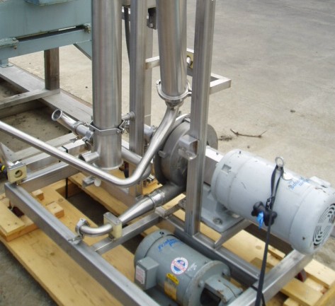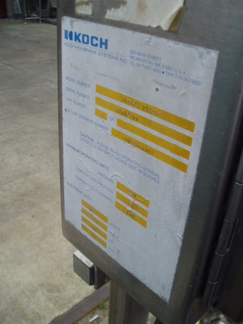 Centrifugal pump, Fristam, model FP3551 250, stainless steel contacts, 2-3/4" inlet, 2" diameter outlet. Driven by approximately 5 HP motor (no nameplate). Complete with electrical start/stop control box. Mounted on a stainless steel portable frame with piping and valves. Previously used with a Koch ultrafiltration membrane system filter, includes (2) cartridge filters. Serial number on pump 355167108. Very good condition.