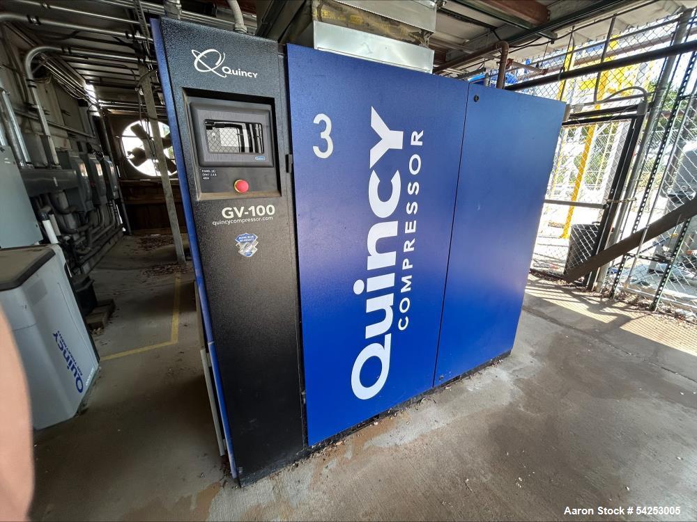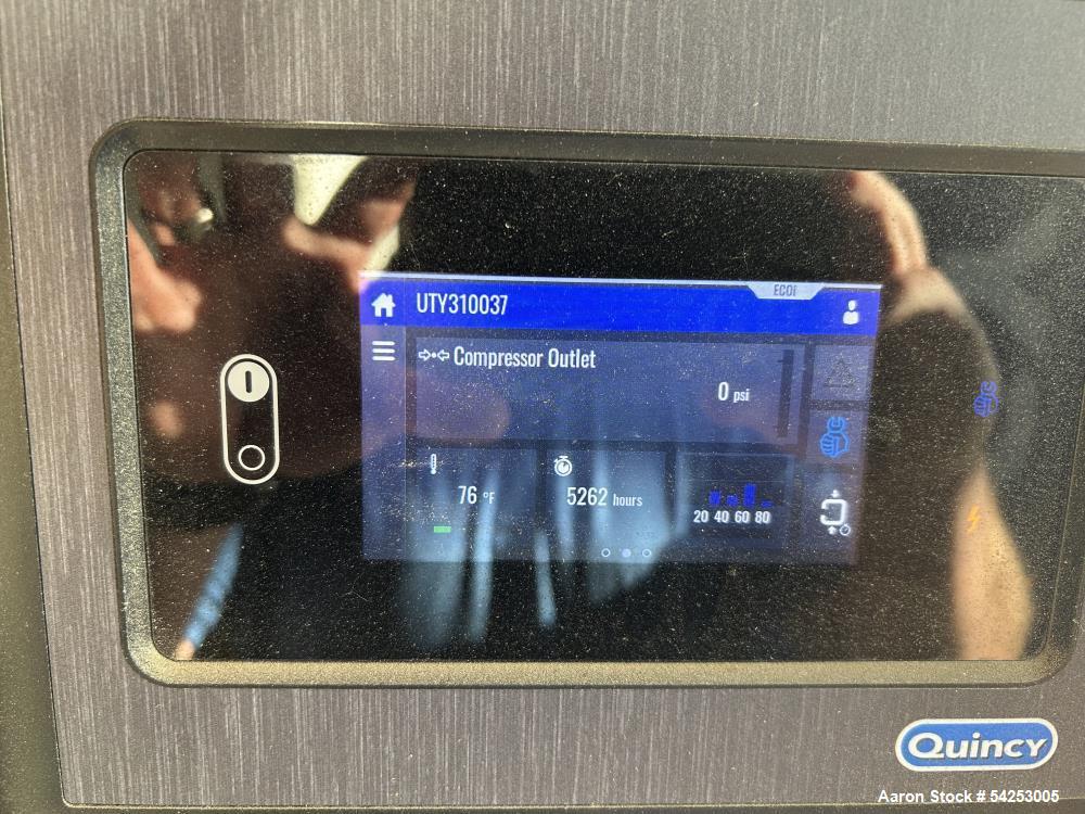 used quincy qgv-100 energy-efficient rotary screw air compressor | 471 cfm | vsd drive, 460v/3-phase. 471 cfm max capacity, 104-110 degrees f maximum ambient temps. water cooling. touchscreen controller (id uty310037) displaying 5,262 hours, 76f internal temp, and 0 psi outlet pressure at time of inspection. control panel shows total panel rating 471a with largest motor fla 163a, nema 4 enclosure. equipped with badger pxe control package, enclosed sound-attenuated cabinet, and emergency stop with lockout provision.