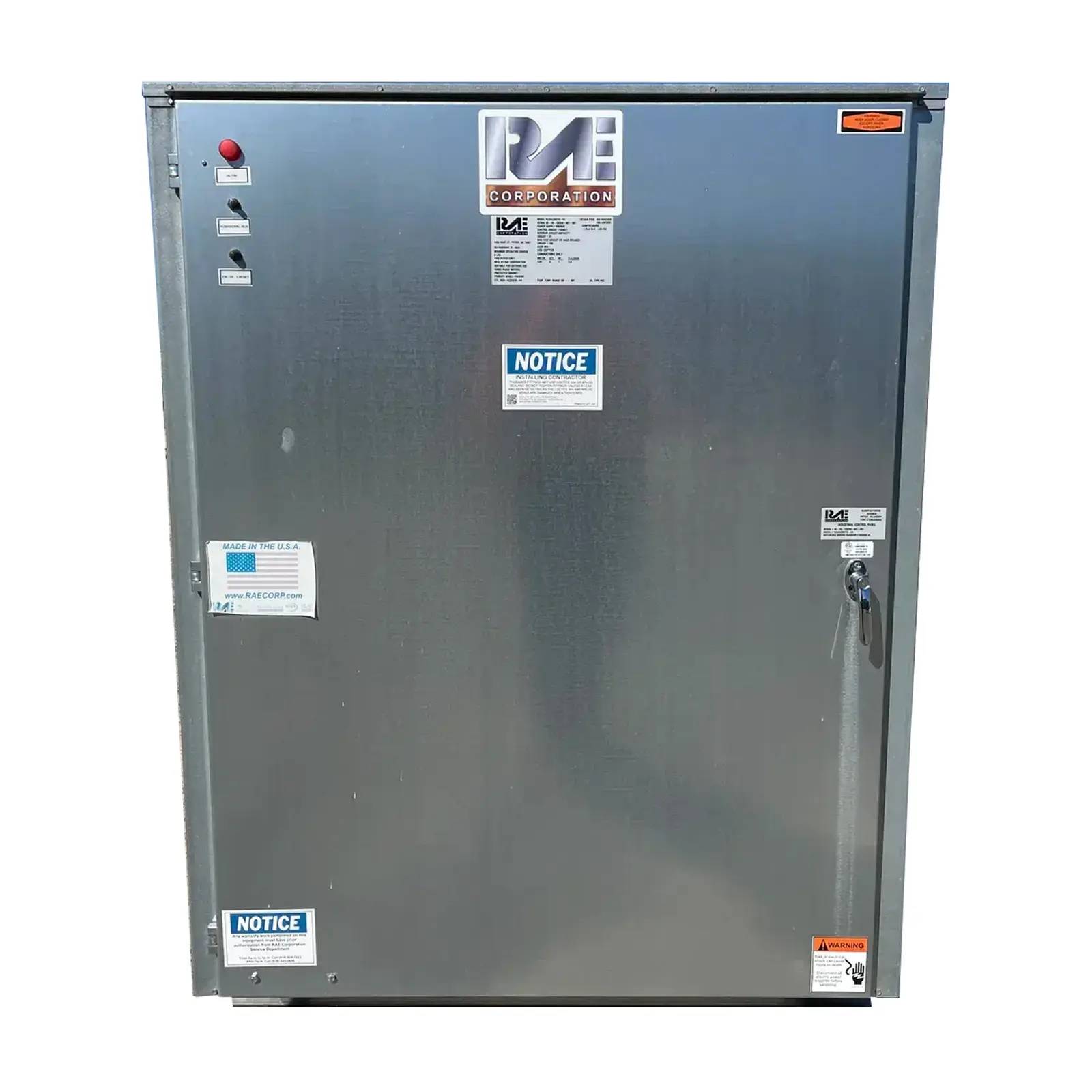 Unused RAE Corporation Air Cooled Condenser. Model: RCUAC3BS15-H4. Serial No: 05-19-135339-001-001. Power Supply: 208/60/3. Control Circuit: 115/60/1. Design Pressure(PSIG): 450 High Side, 180 Low Side. Bitzer Us, Inc Compressor(1): 15 HP, RLA: 59.6, LRA: 252. Fan Motors (1): Qty: 3, HP: 1, FLA Each: 4.6. Evap. Temperature. Range: 10F - 45F. Suitable for outdoor use. Previous Refrigerant: R-404A.